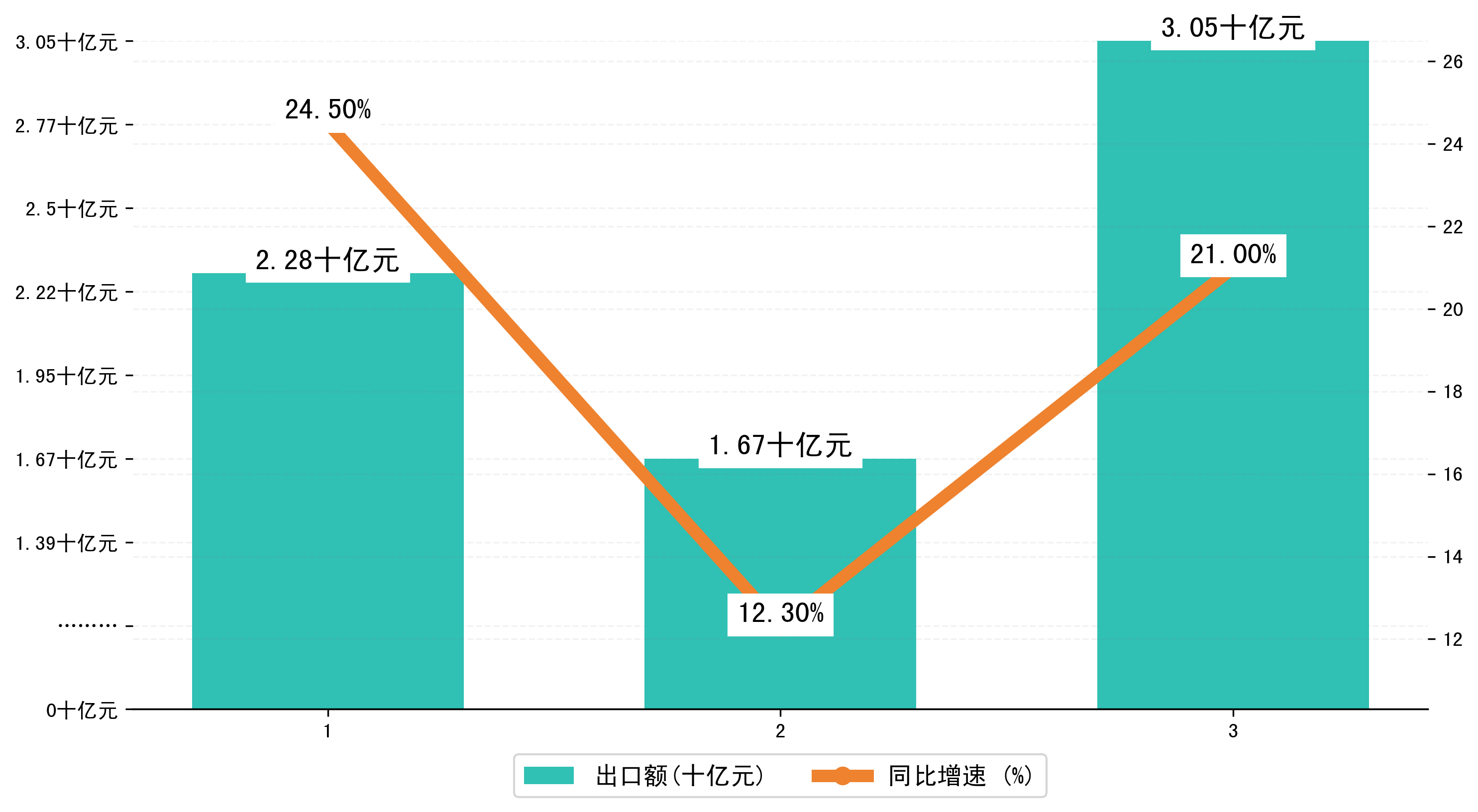 以美元计,2025年1-3月海口市出口额为9,7435.3068万美元,相比上年同期增加了1,6445.8297万美元,同比增加19.70%。