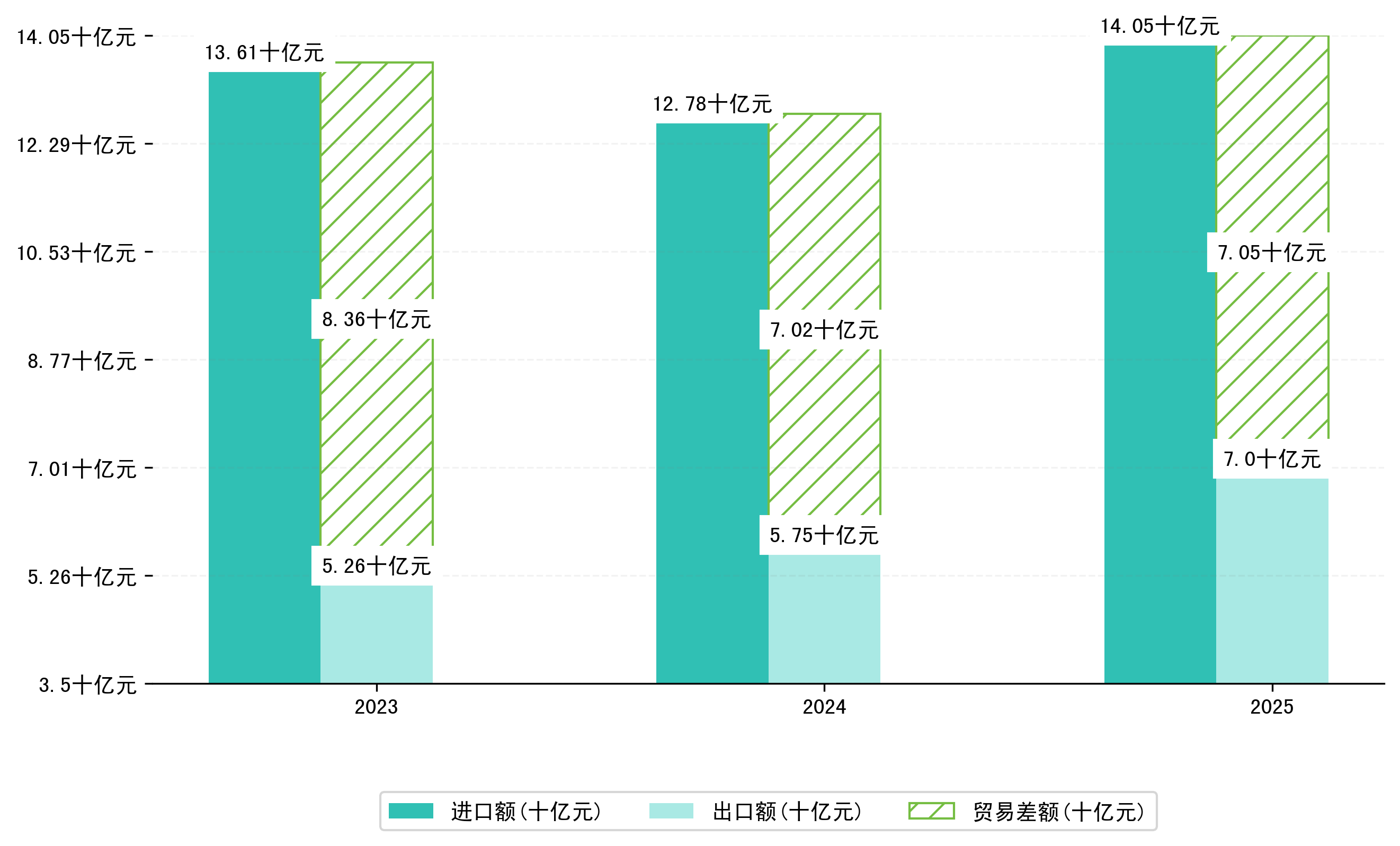 以人民币计,2025年1-3月海口市贸易差额为70,4970,7592万元(贸易逆差),相比上年同期减少了2522,4733万元,同比减少0.36%。