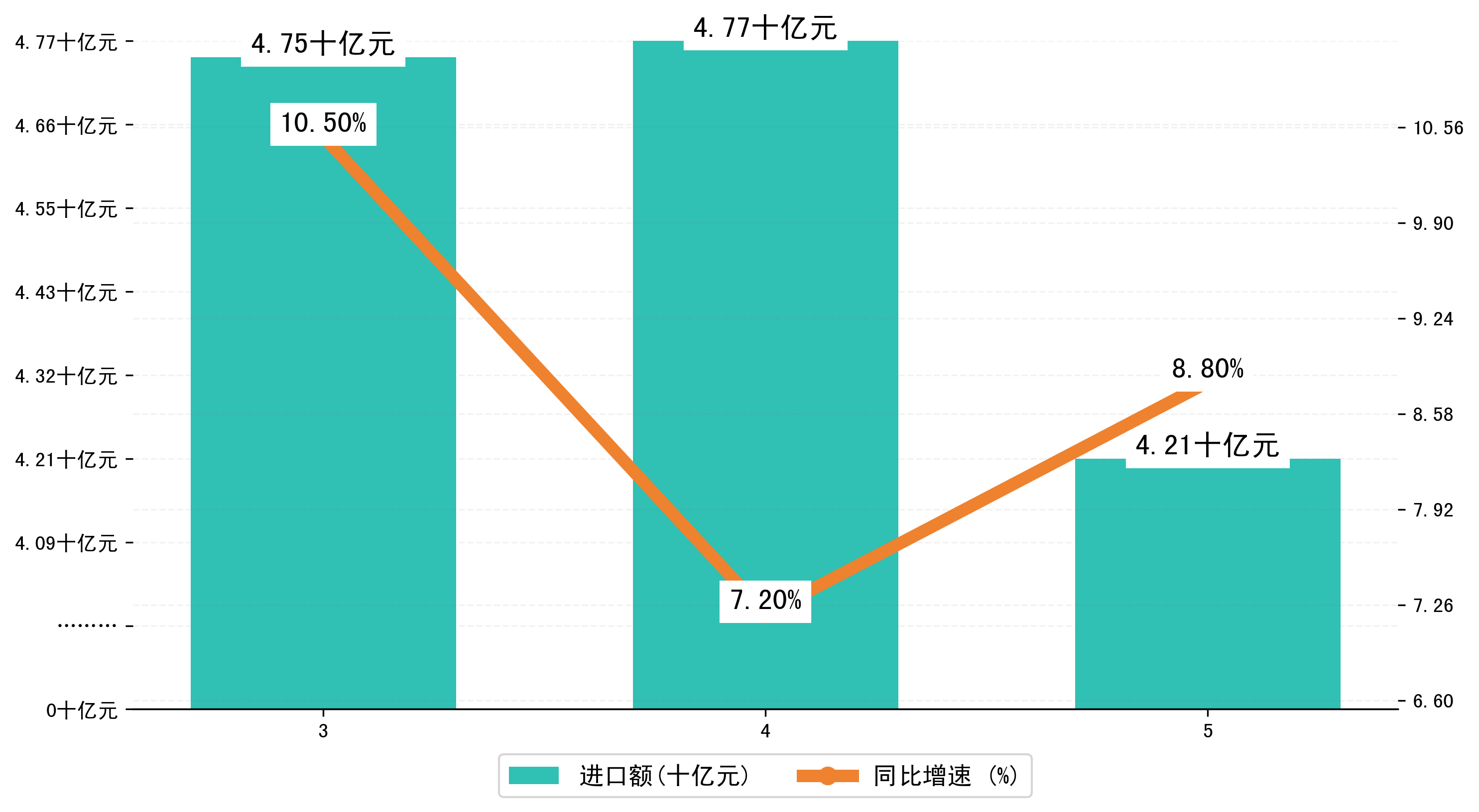 以人民币计,2025年5月海口市进口额为42,0611.0972万元,相比上月减少了5,6645.1418万元;相比上年同期增加了6,1827.8895万元,同比增加了8.80%。