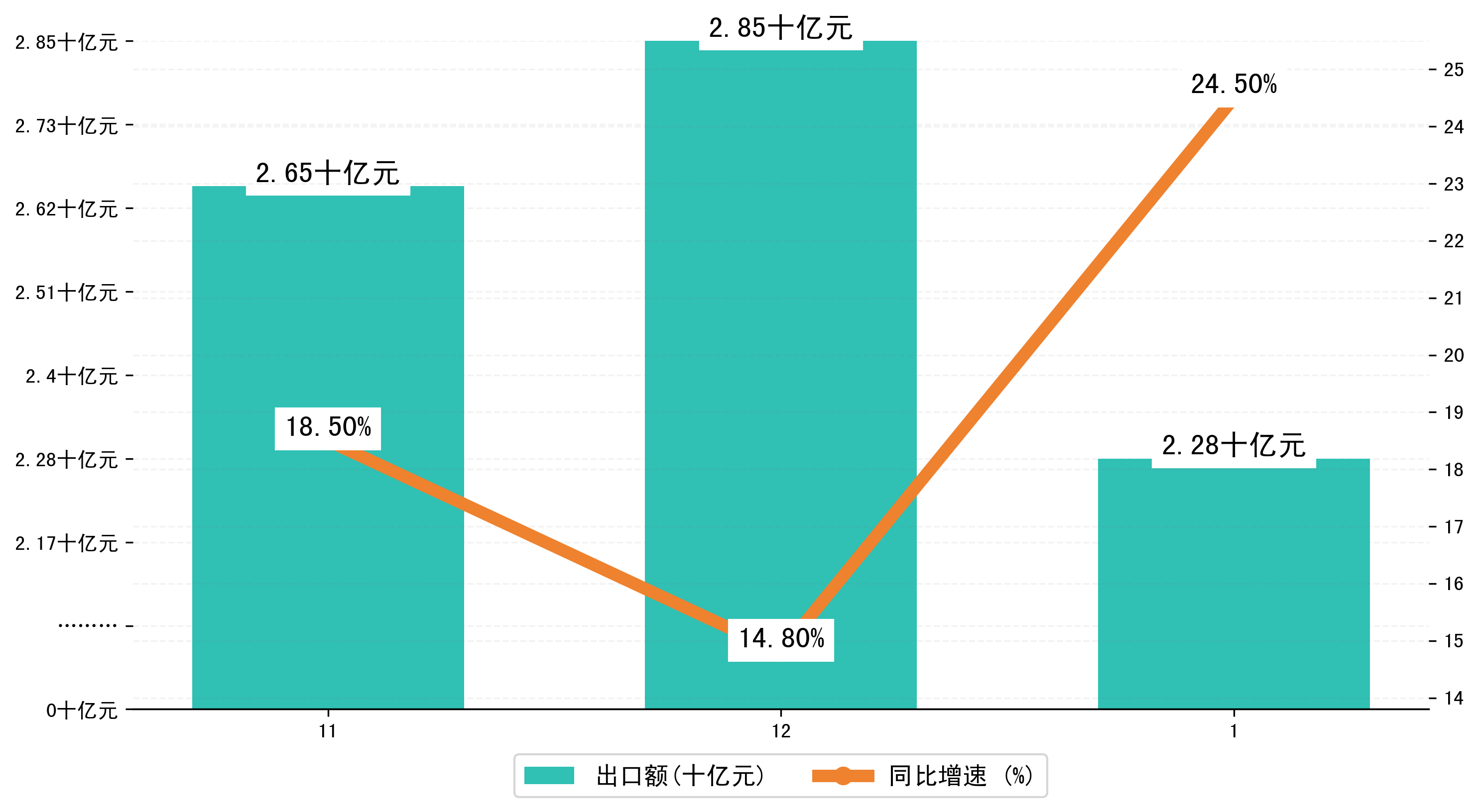 以美元计,2025年1-1月海口市出口额为3,1735.7057万美元,相比上年同期增加了5948.1867万美元,同比增加22.90%。