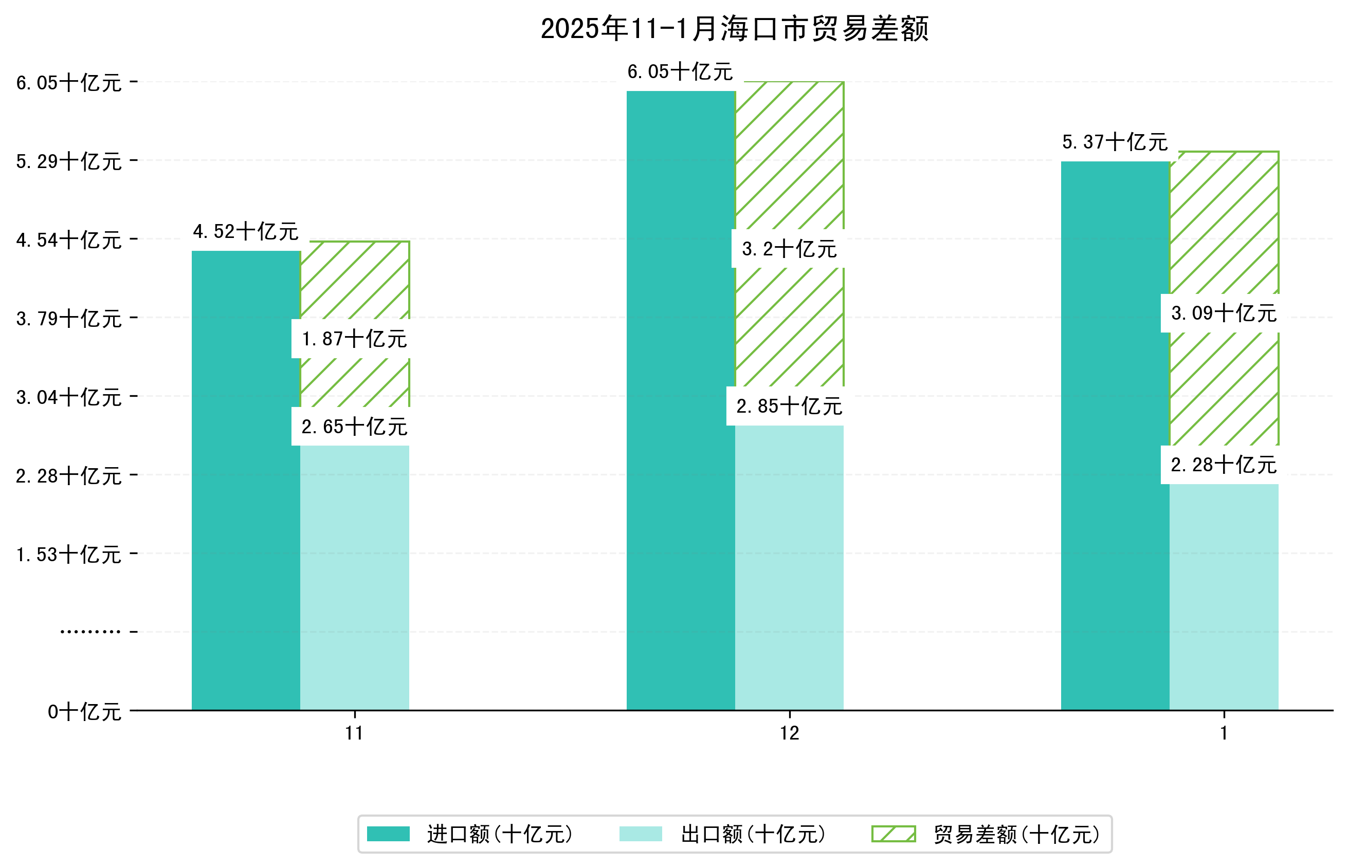 以人民币计,2025年1-1月海口市贸易差额为30,9038,6595万元(贸易逆差),相比上年同期增加了4,9327,9057万元,同比增加-13.76%。