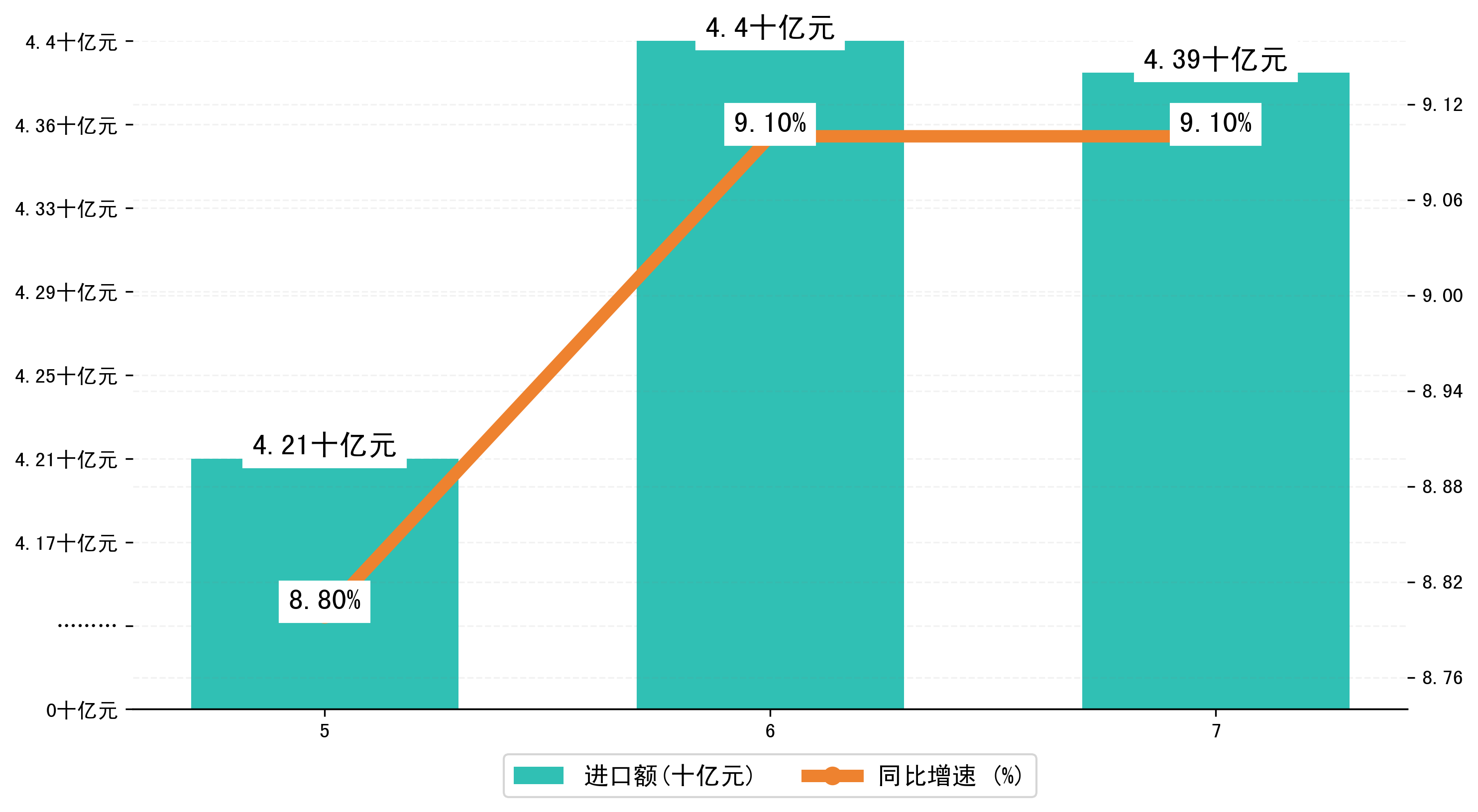 以美元计,2025年1-7月海口市进口额为44,2383.9842万美元,相比上年同期增加了3,2048.81万美元,同比增加7.90%。
