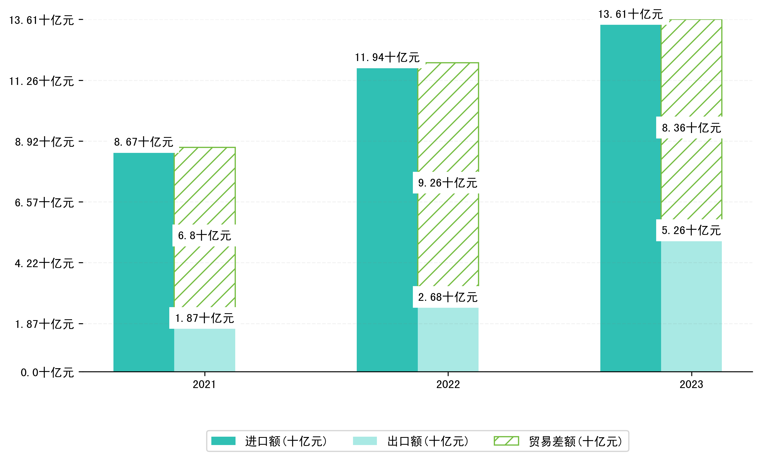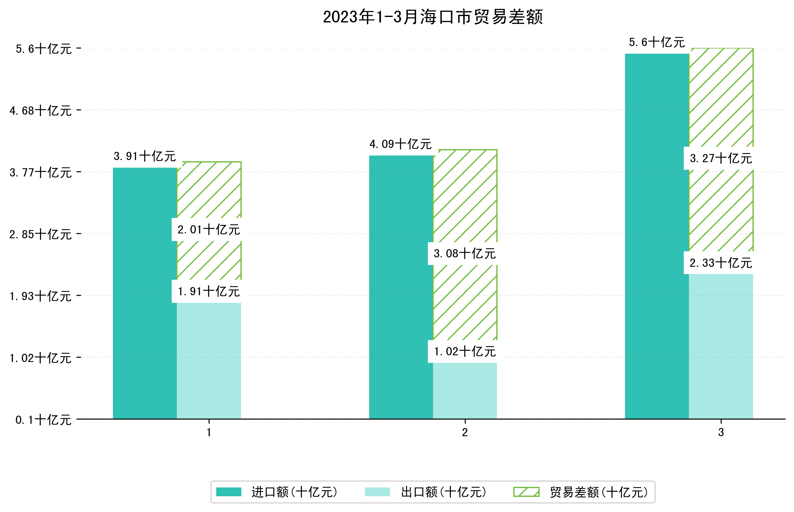 以人民币计,2023年3月海口市贸易差额为32,6860,3041万元(贸易逆差),相比上月减少了1,9335,9981万元,即2590,5463万美元;相比上年同期减少了2,3039,2727万元,同比减少7.58%。