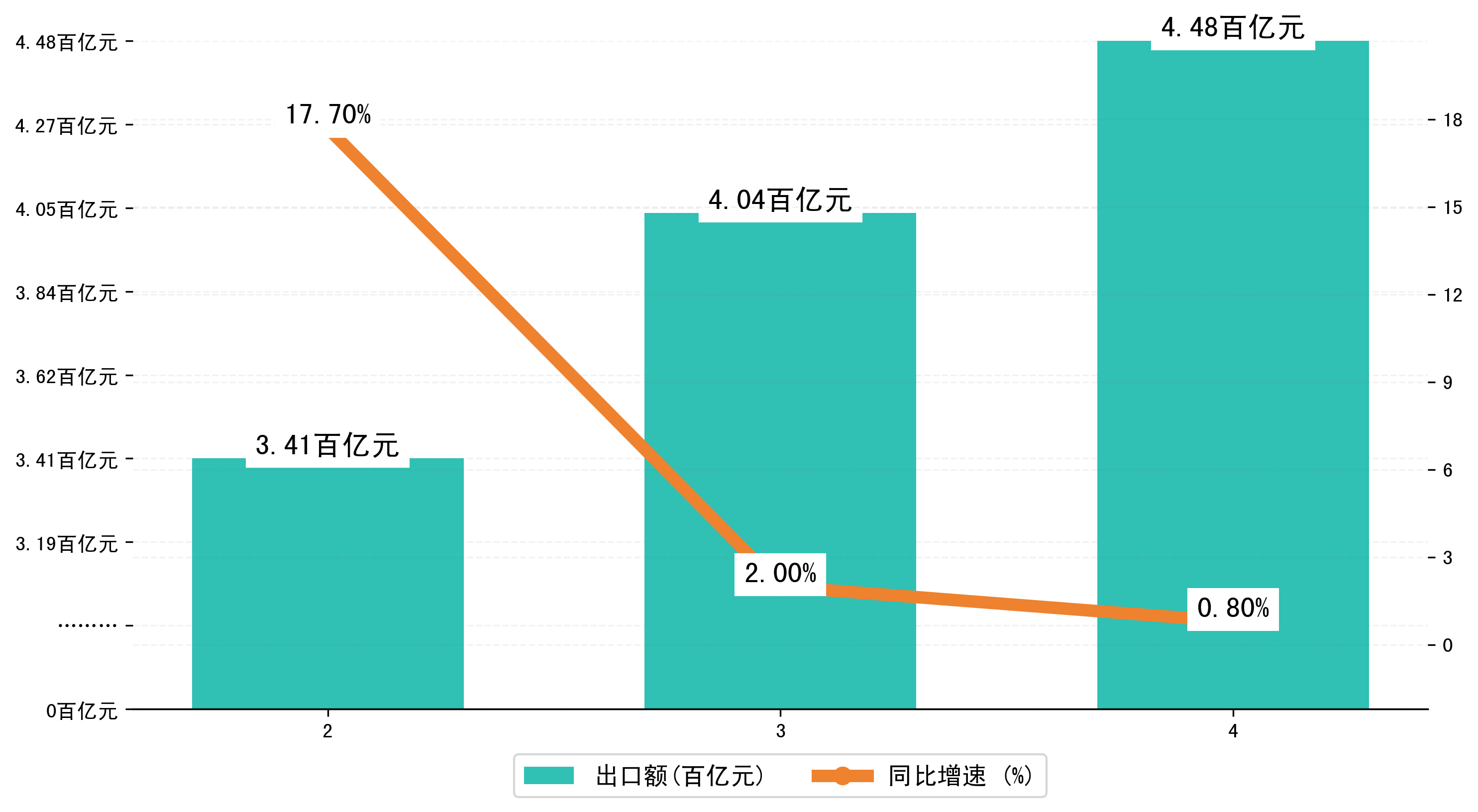 以人民币计,2024年4月杭州市出口额为448,0190.2605万元,相比上月增加了44,2999.5691万元;相比上年同期减少了23,5778.6185万元,同比增加了0.80%。