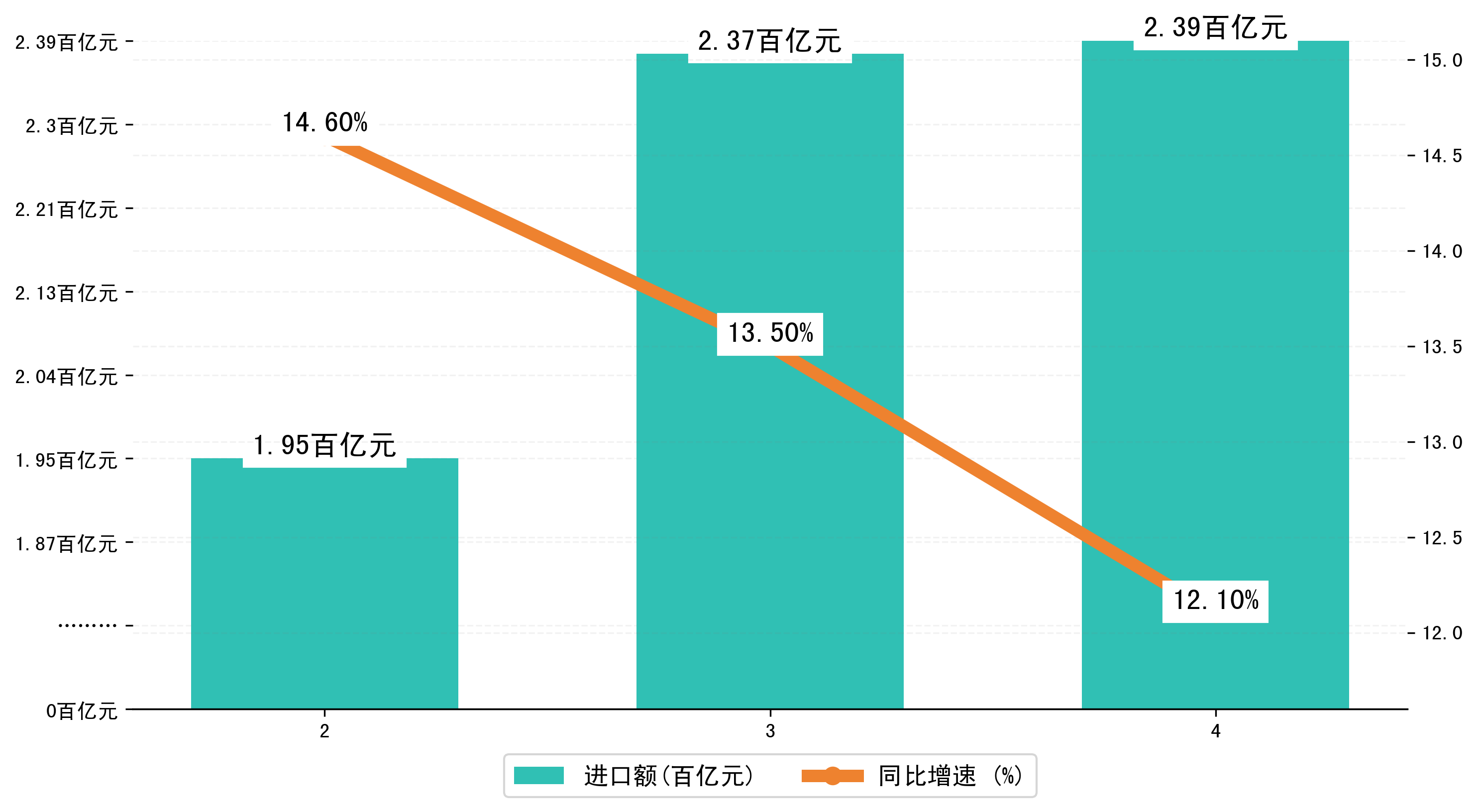 以人民币计,2024年4月杭州市进口额为238,5369.5854万元,相比上月增加了1,3670.5727万元;相比上年同期增加了14,8223.4019万元,同比增加了12.10%。