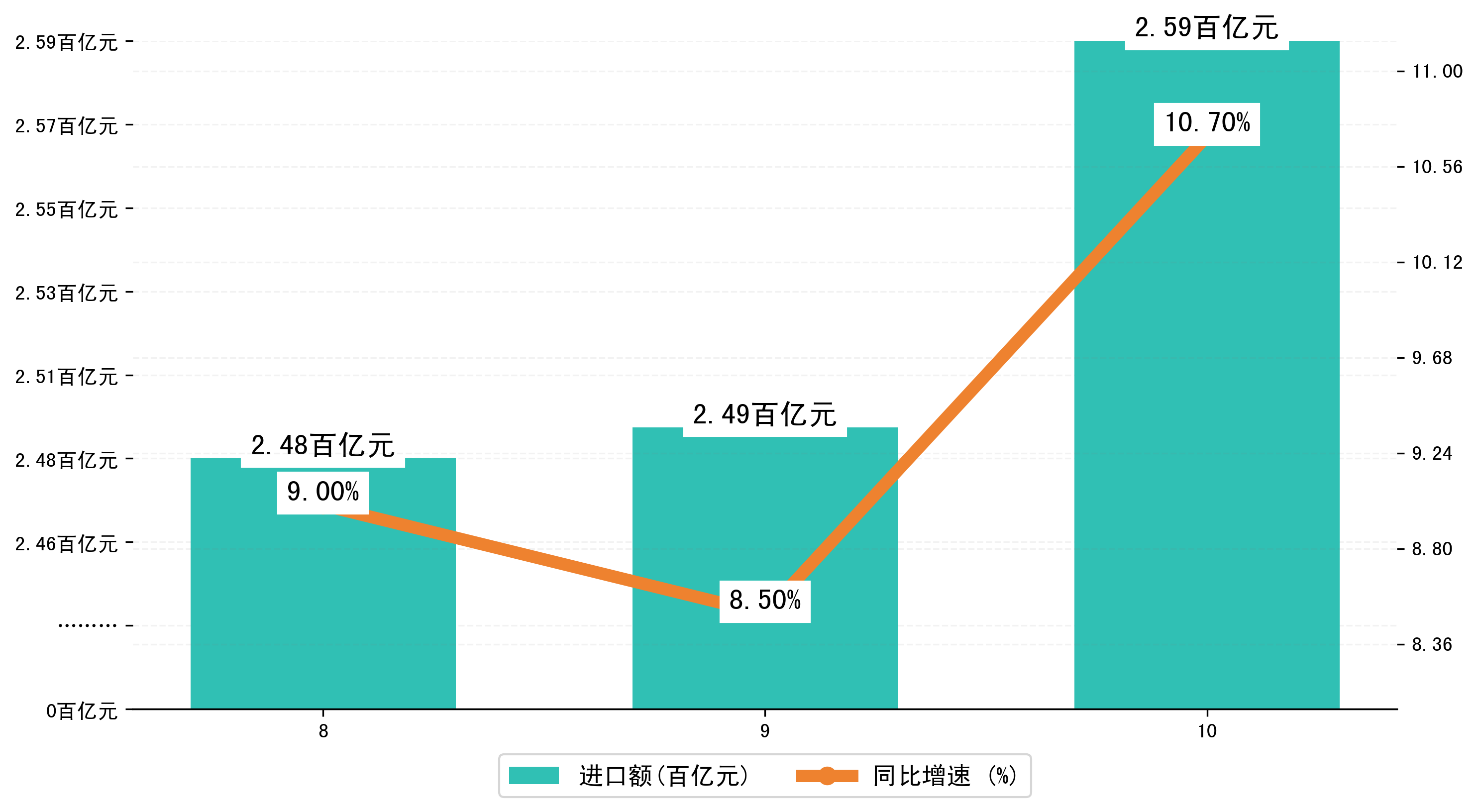 以人民币计,2023年10月杭州市进口额为259,3942.3794万元,相比上月增加了10,1266.3643万元;相比上年同期增加了62,0643.4694万元,同比增加了10.70%。