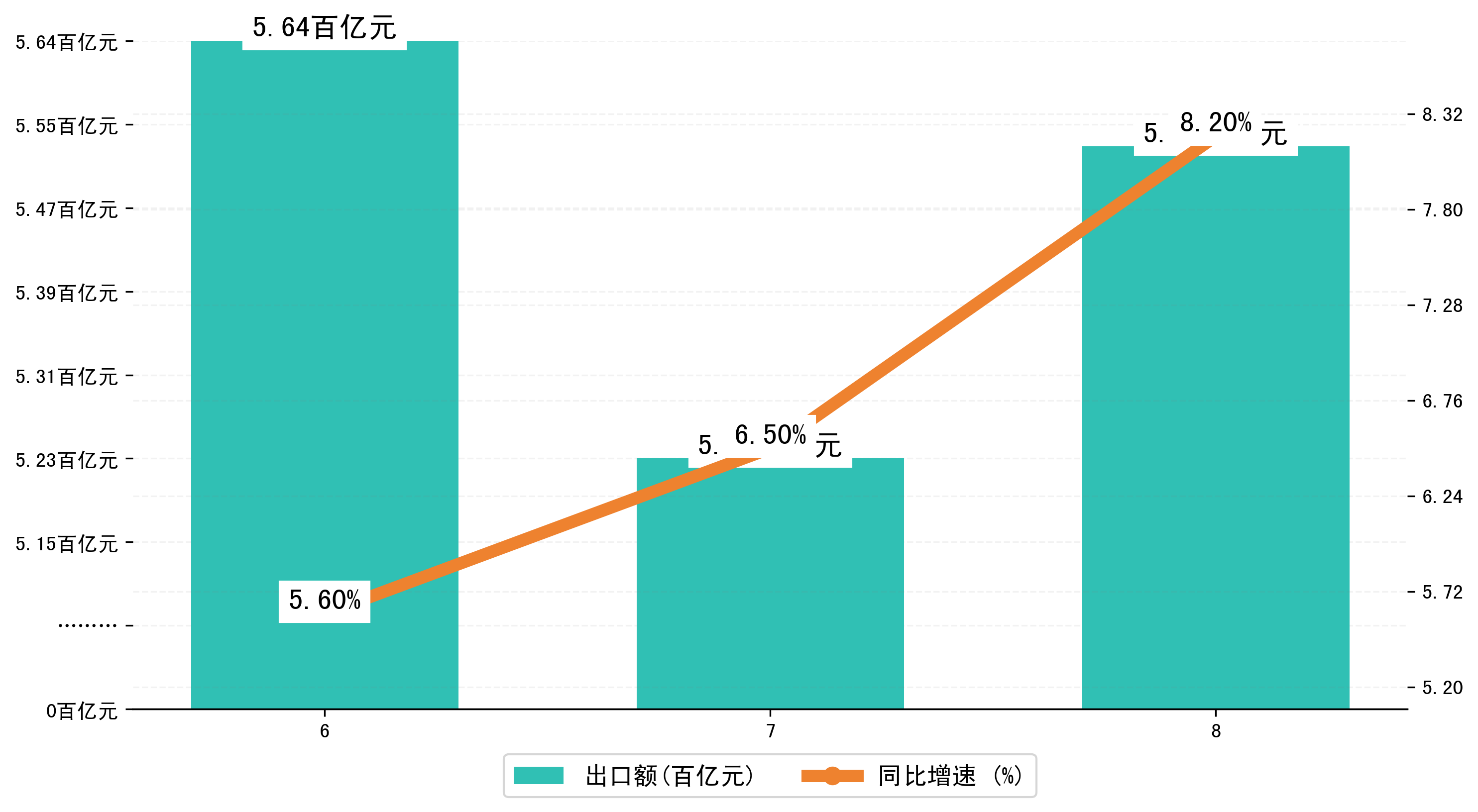 以人民币计,2024年1-8月杭州市出口额为3813,8253.5583万元,相比上年同期增加了289,6127.8621万元,同比增加了8.20%。