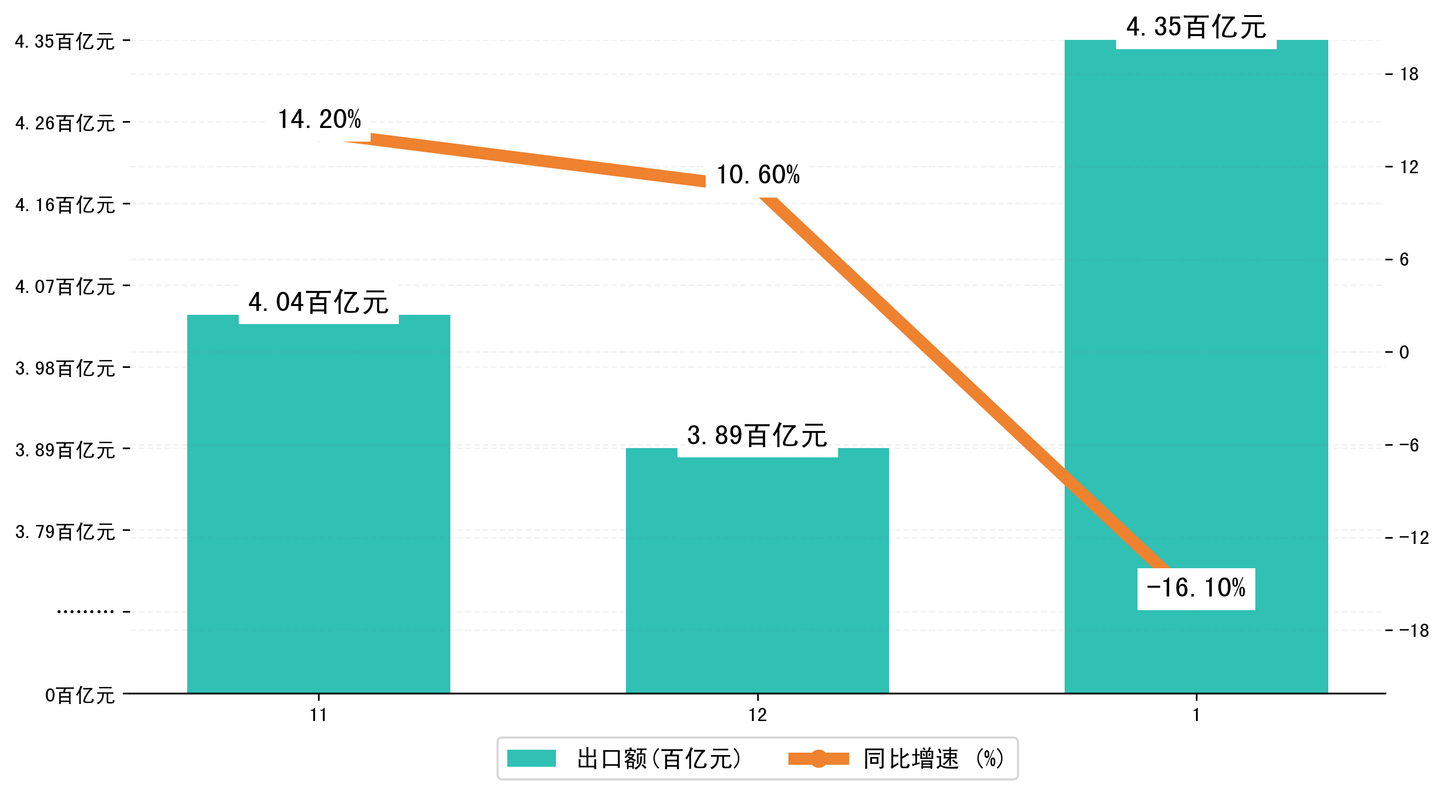 以人民币计,2023年1月杭州市出口额为434,9140.2373万元,相比上月增加了46,3491.5552万元;相比上年同期减少了84,3039.6309万元,同比减少了-16.10%。