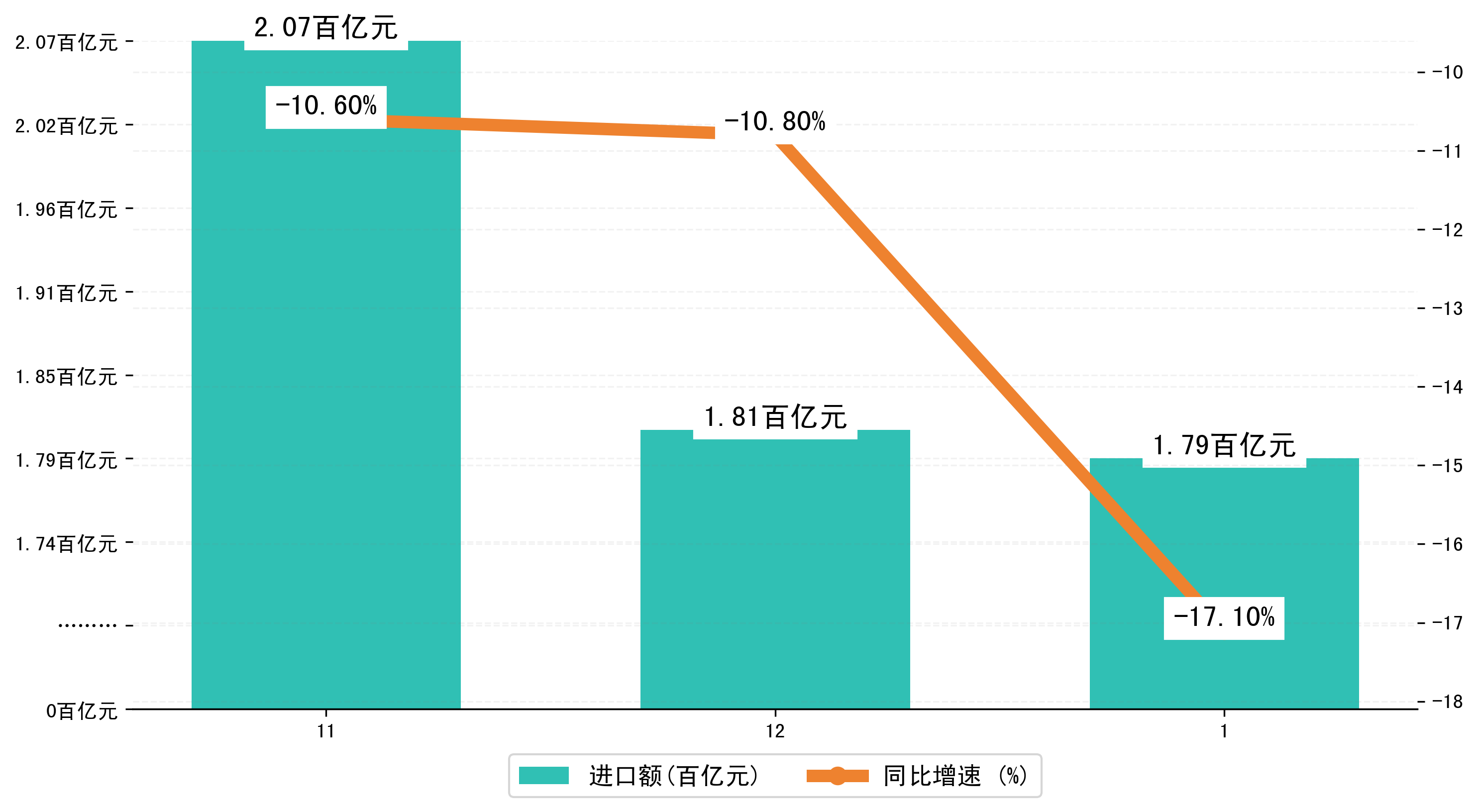 以人民币计,2023年1月杭州市进口额为179,3710.6936万元,相比上月减少了1,9099.5273万元;相比上年同期减少了30,9624.1206万元,同比减少了-17.10%。