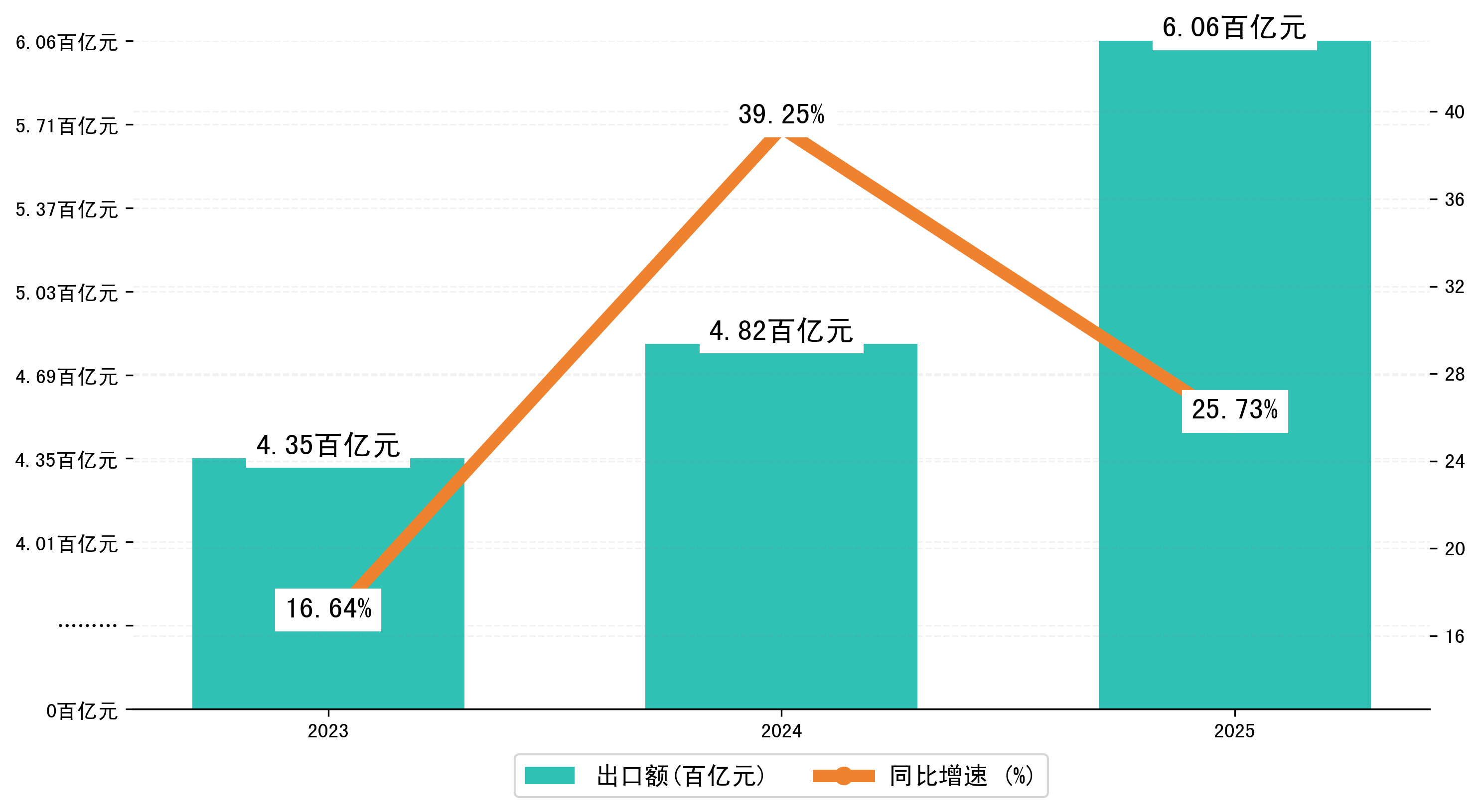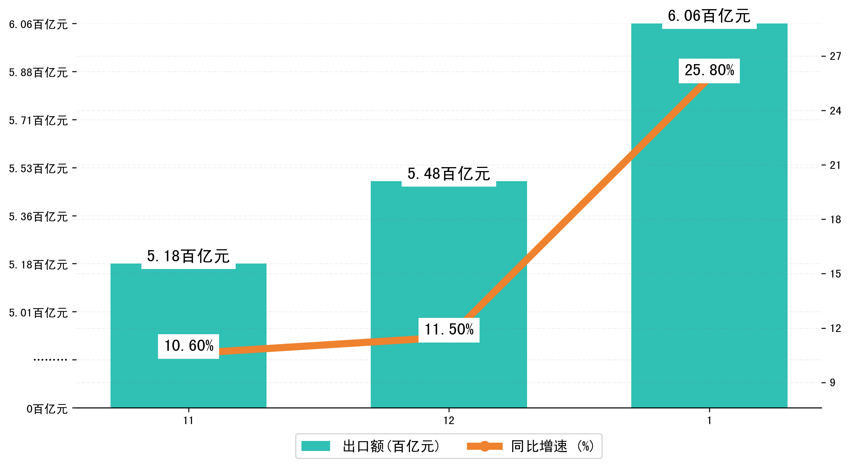 以人民币计,2025年1-1月杭州市出口额为605,6238.8306万元,相比上年同期增加了123,9516.1895万元,同比增加了25.80%。