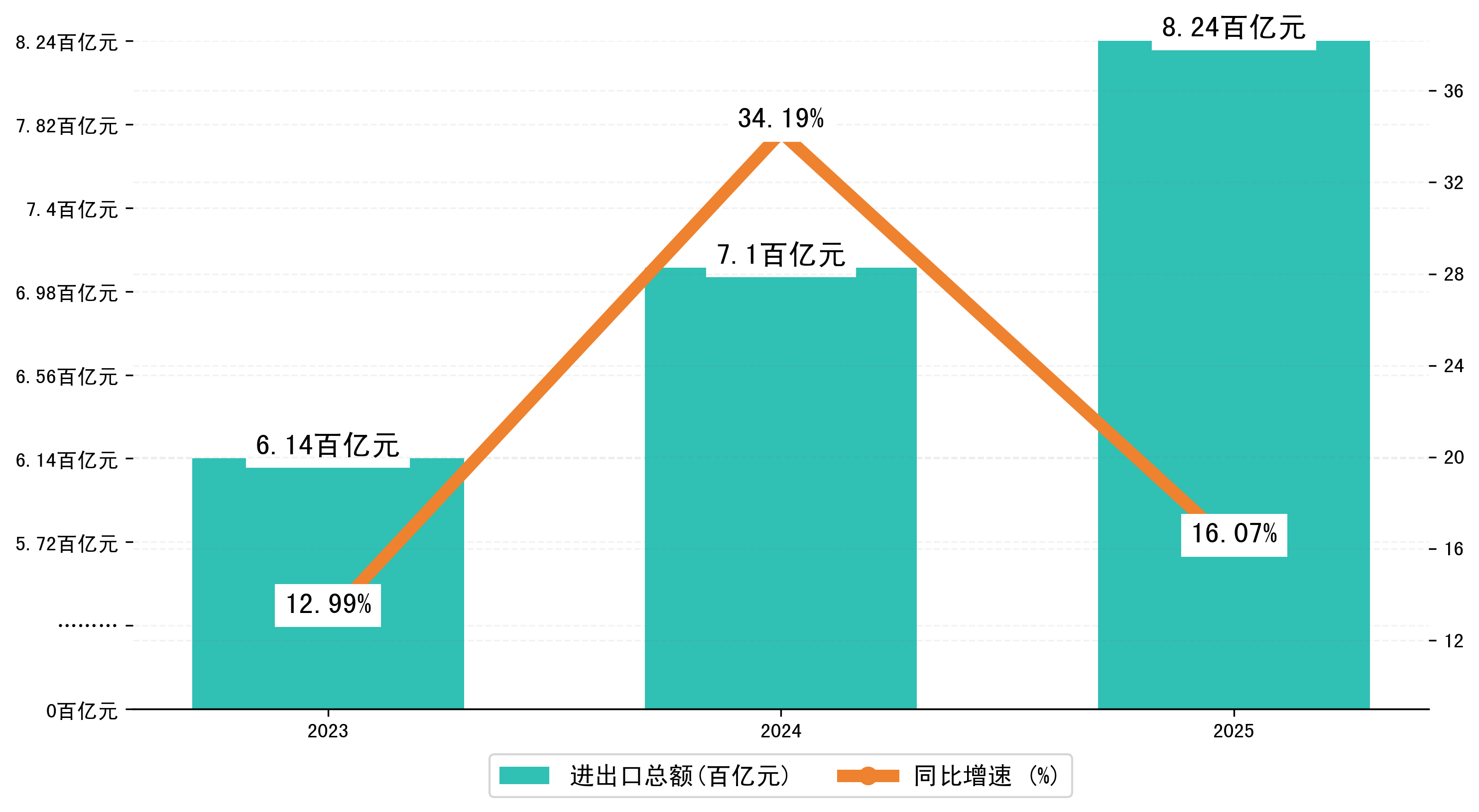 以人民币计,2025年1月杭州市进出口总额为824,3032.2193万元,相比上月增加了49,9965.9503万元;相比上年同期增加了114,1020.1513万元,同比增加了15.90%。