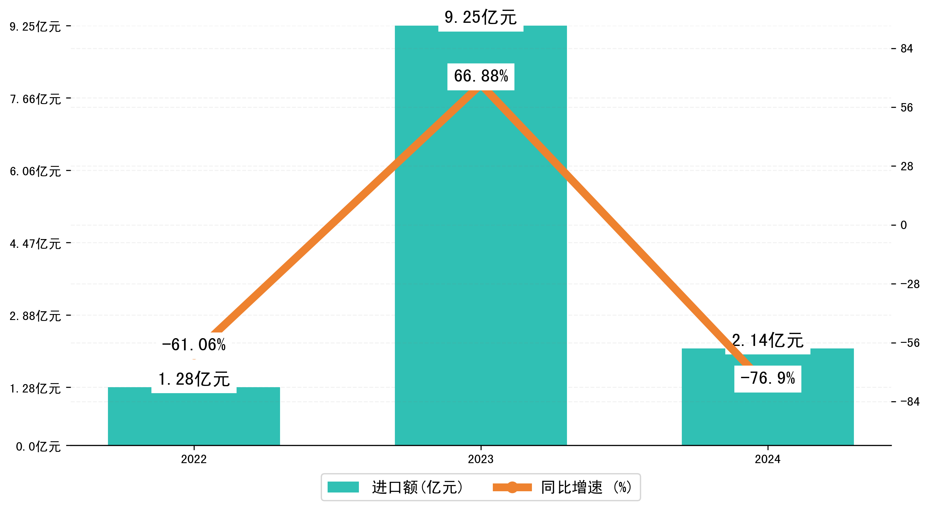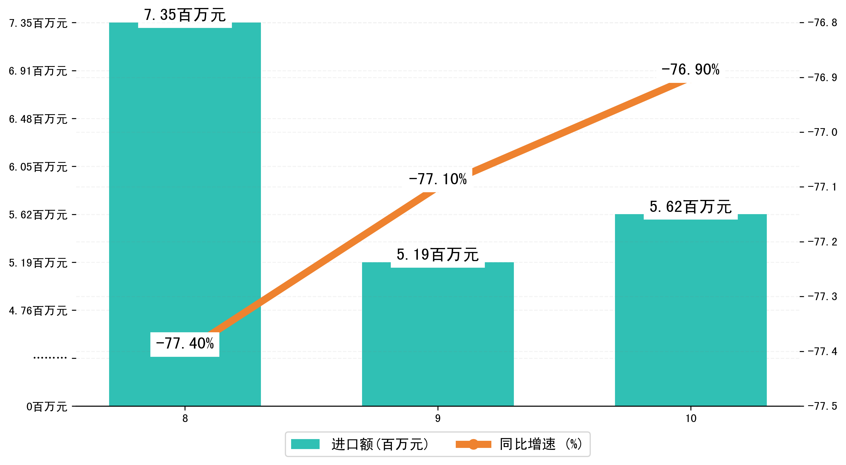 以美元计,2024年1-10月汉中市进口额为3010.5921万美元,相比上年同期减少了1,0399.7334万美元,同比减少-77.60%。