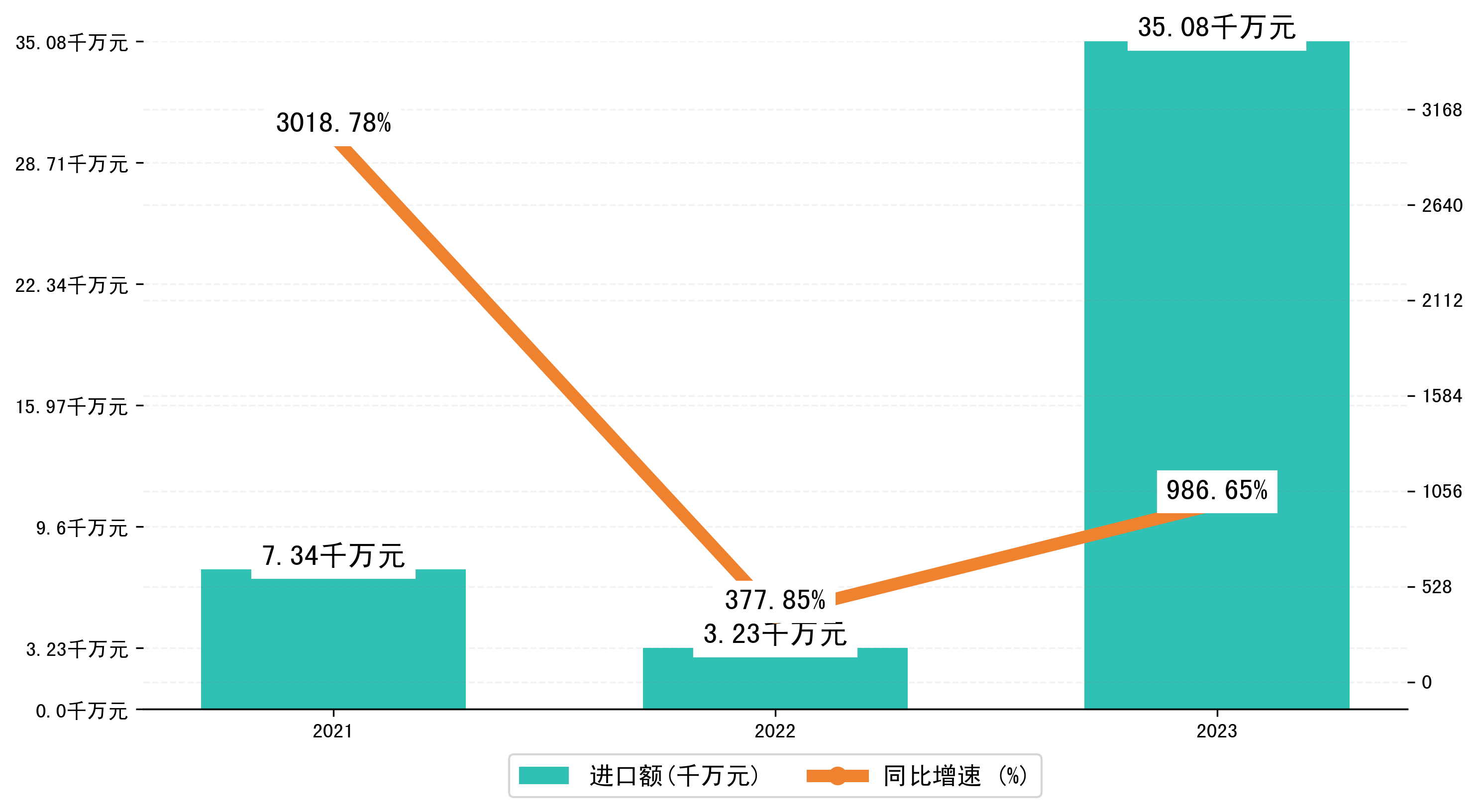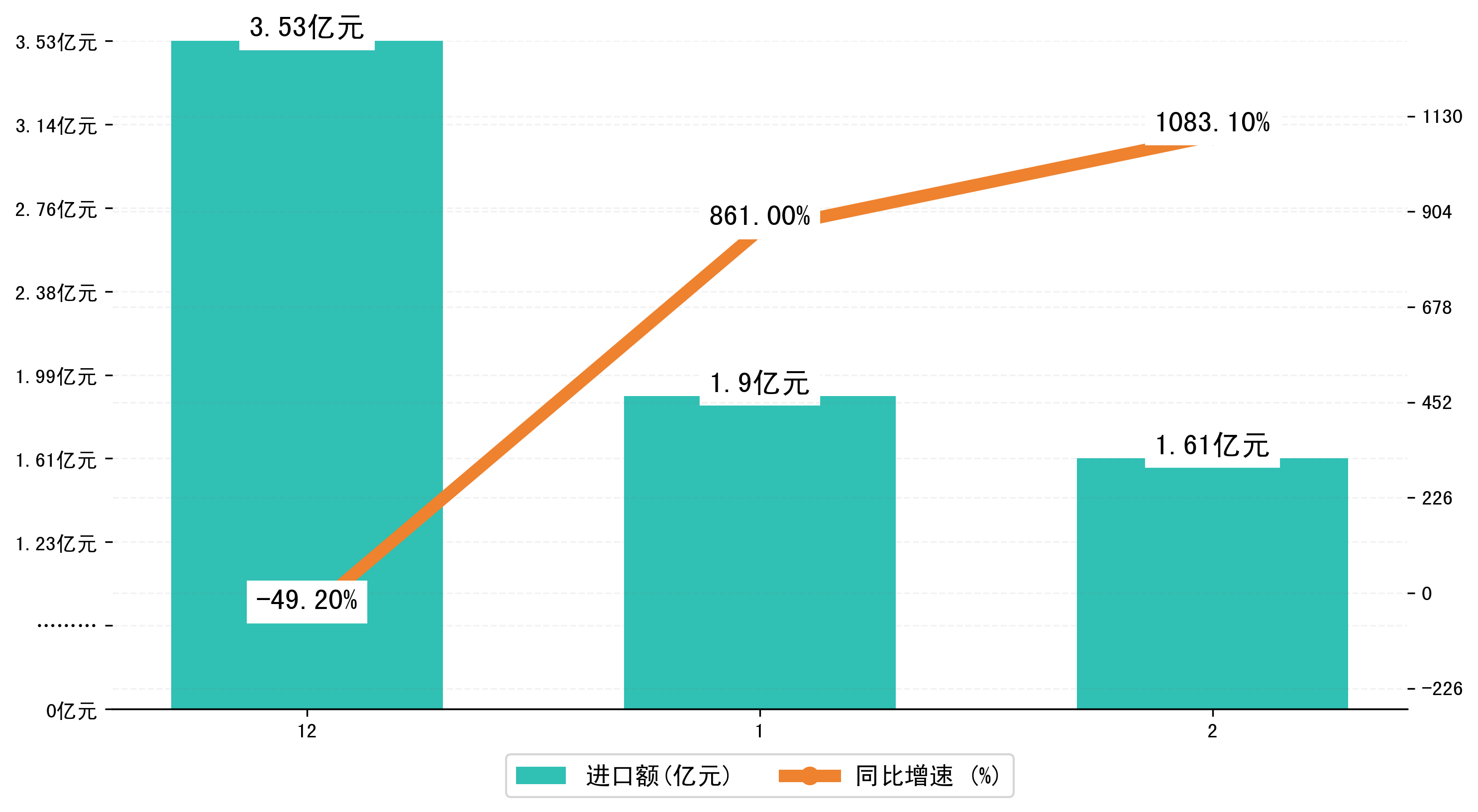 以人民币计,2023年1-2月汉中市进口额为3,5083.6631万元,相比上年同期增加了3,1855.0687万元,同比增加了1083.10%。