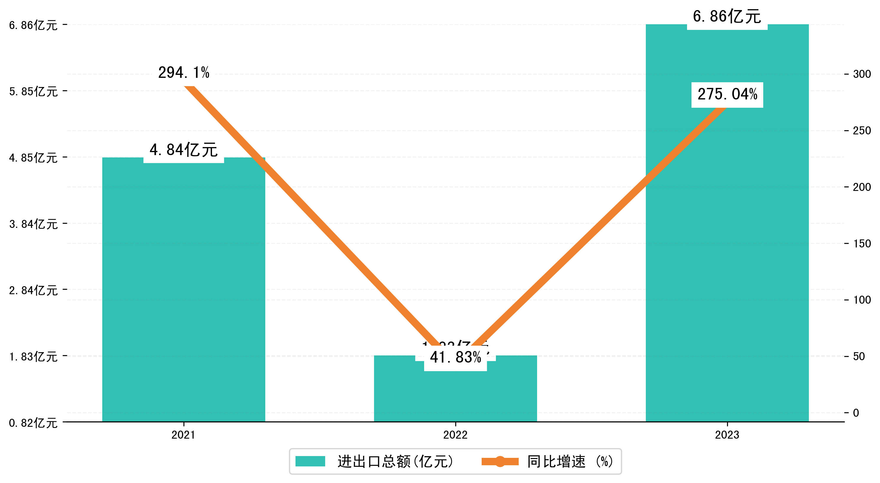 以美元计,2023年1-2月汉中市进出口总额为9944.2567万美元,相比上年同期增加了7074.1287万美元,同比增加251.50%。