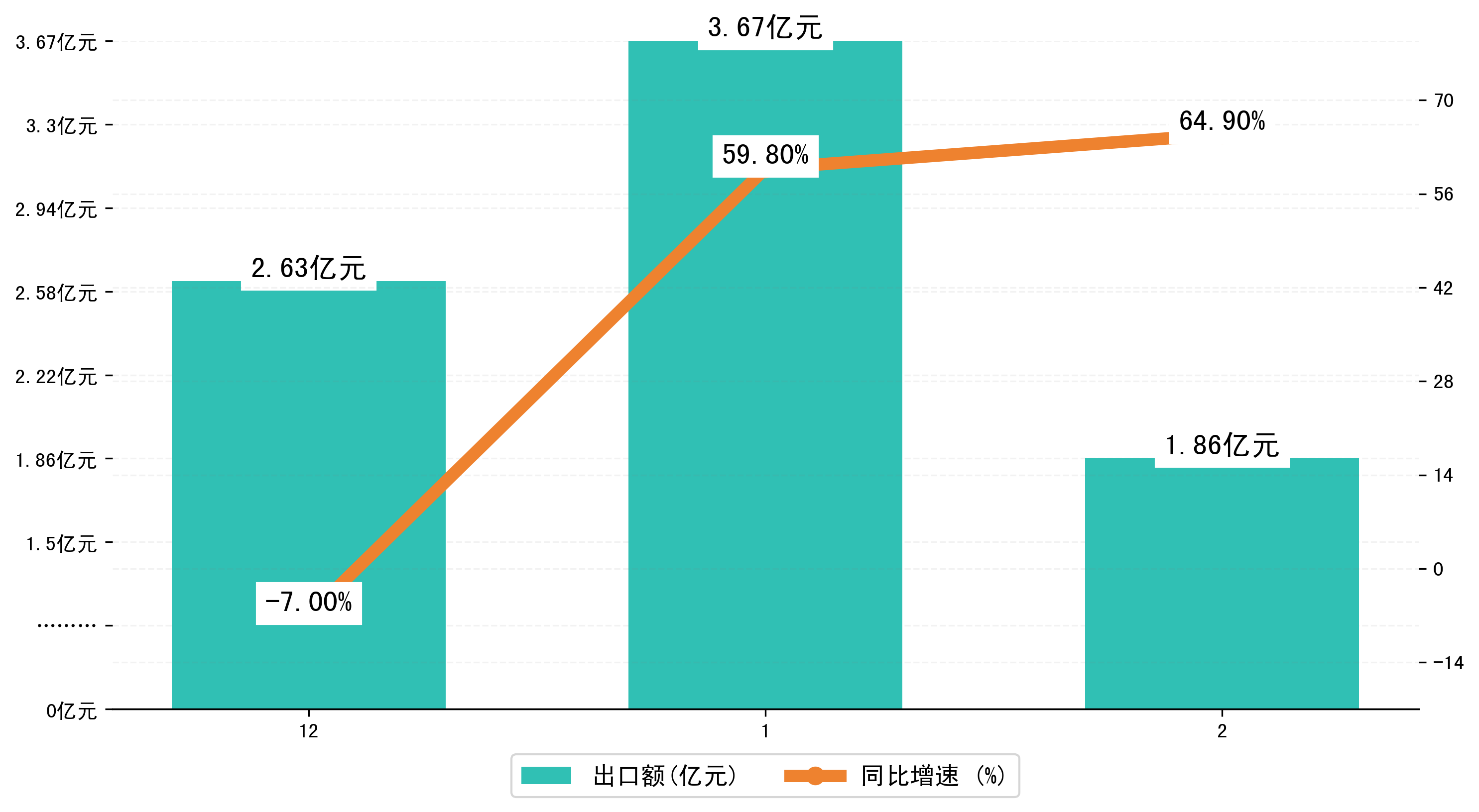 以人民币计,2024年1-2月汉中市出口额为5,5247.5681万元,相比上年同期增加了2,1736.3653万元,同比增加了64.90%。
