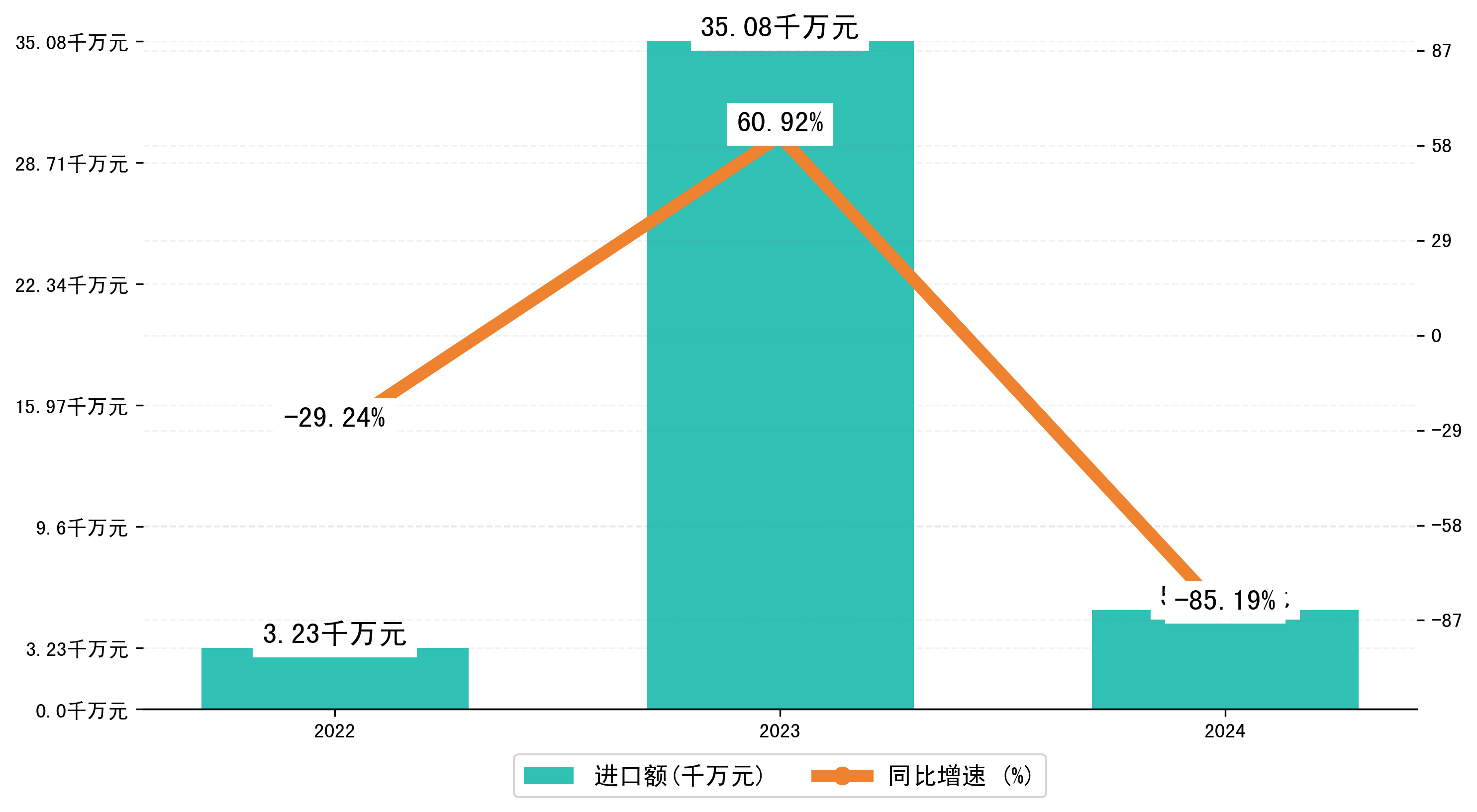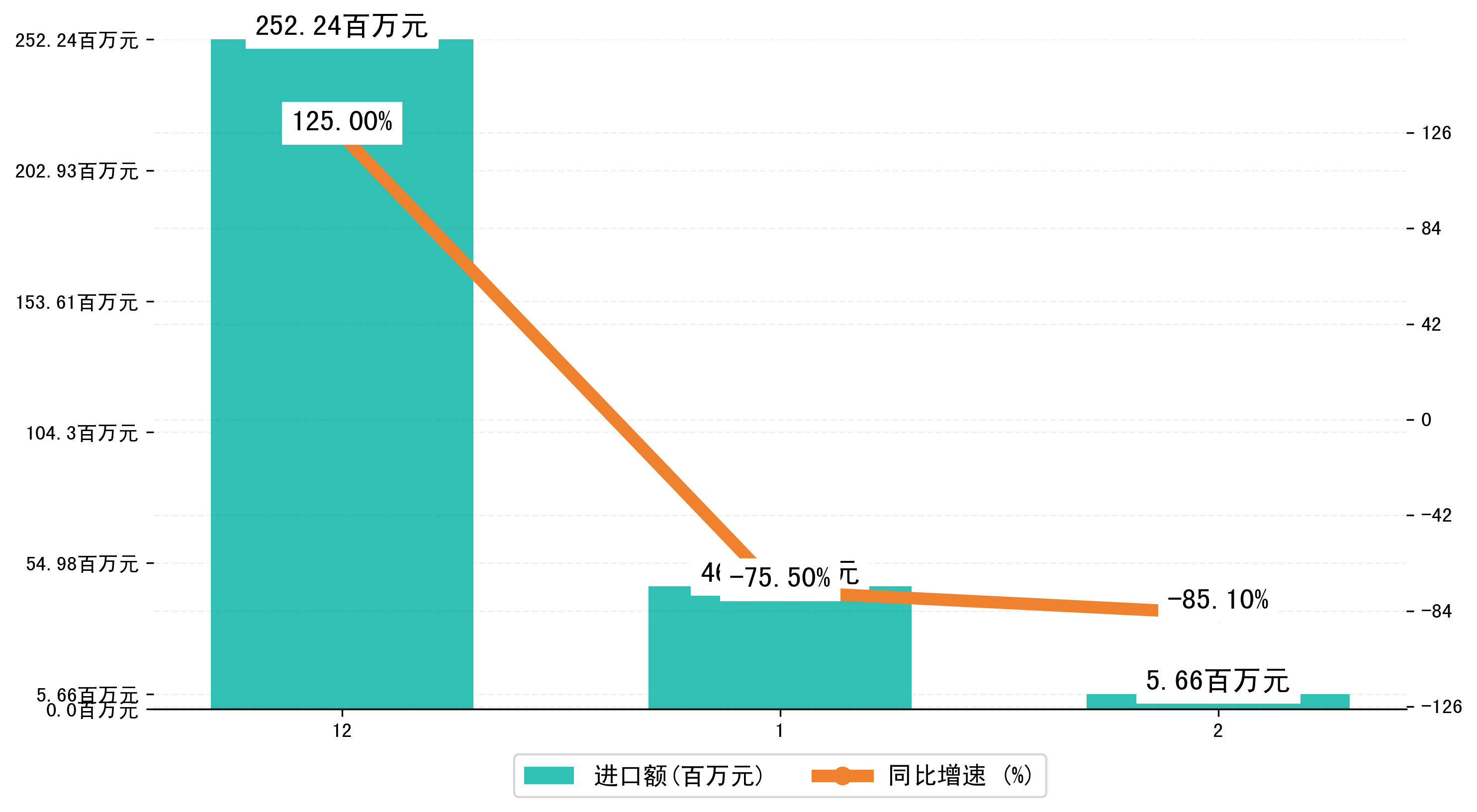 以美元计,2024年1-2月汉中市进口额为731.9655万美元,相比上年同期减少了4373.3018万美元,同比减少-85.60%。