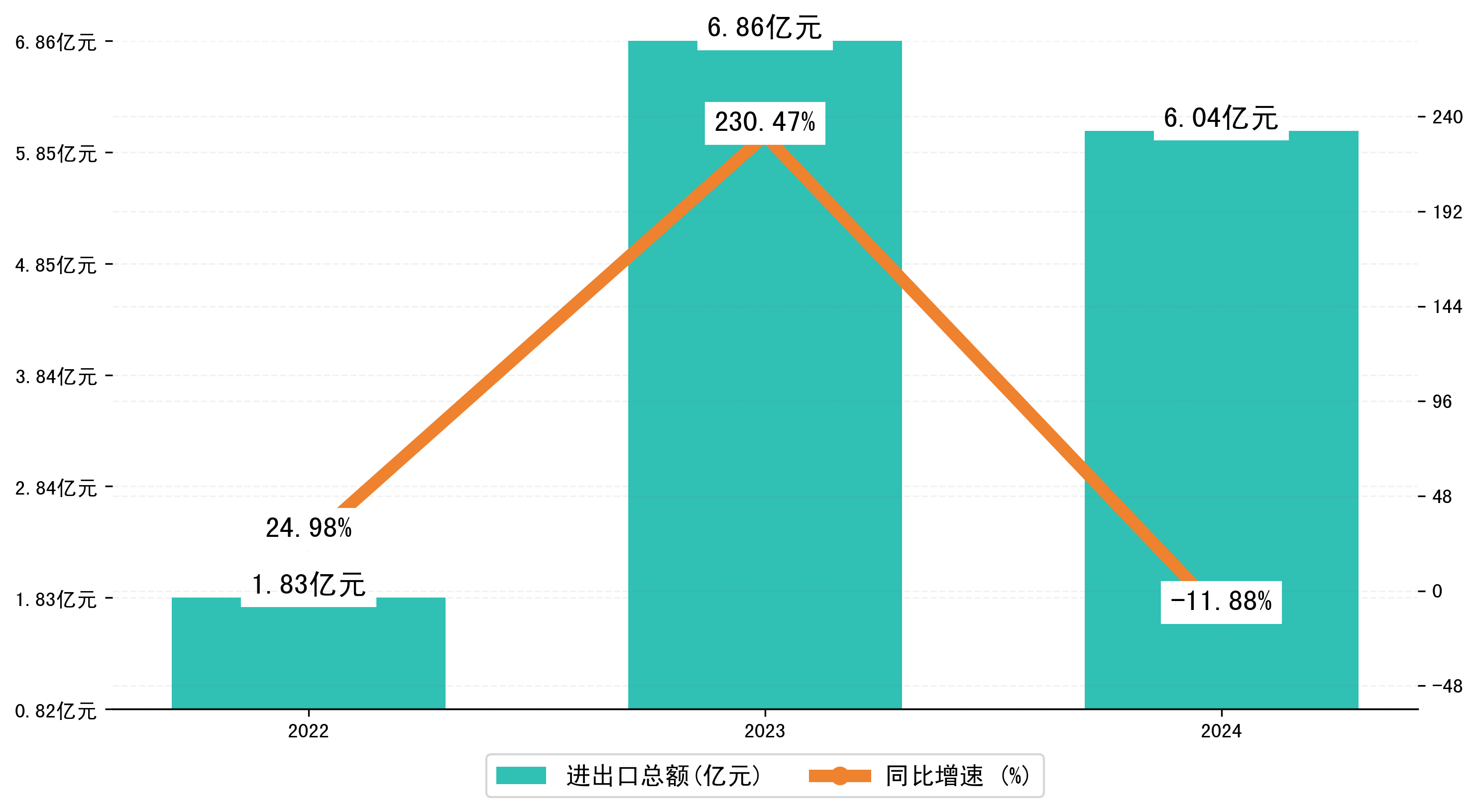 以人民币计,2024年1-2月汉中市进出口总额为6,0442.9539万元,相比上年同期减少了8151.9121万元,同比减少了-11.70%。