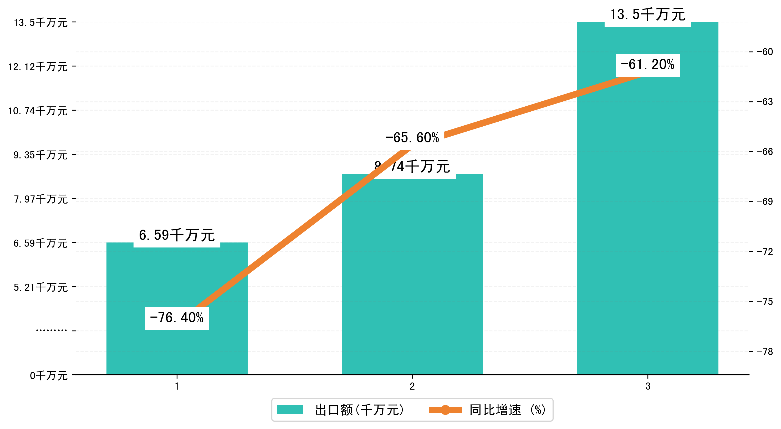 以人民币计,2024年3月石河子市出口额为1,3496.26万元,相比上月增加了4761.1542万元;相比上年同期减少了1,6228.4856万元,同比减少了-61.20%。