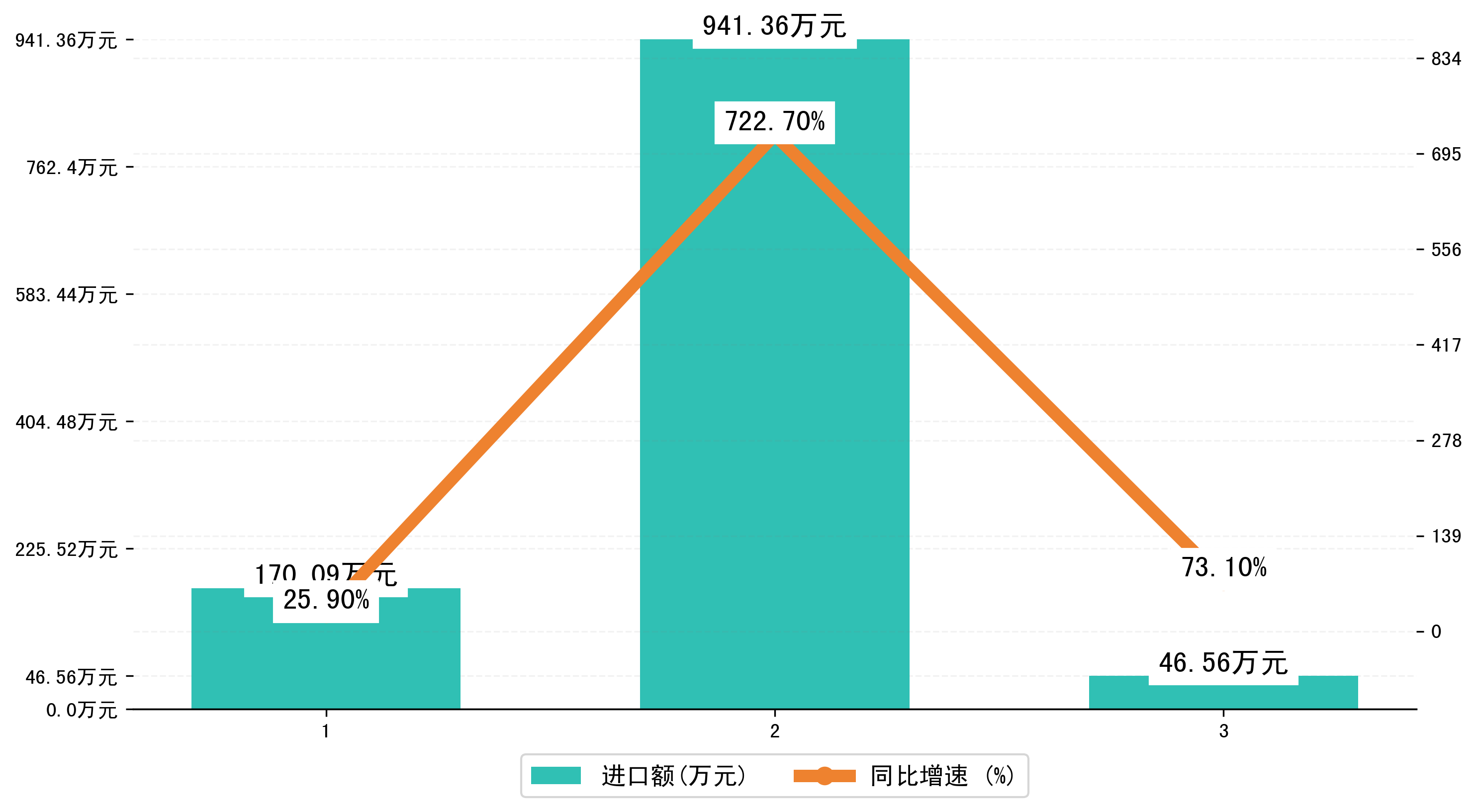 以人民币计,2024年3月石河子市进口额为46.5565万元,相比上月减少了894.8035万元;相比上年同期减少了487.2501万元,同比增加了73.10%。