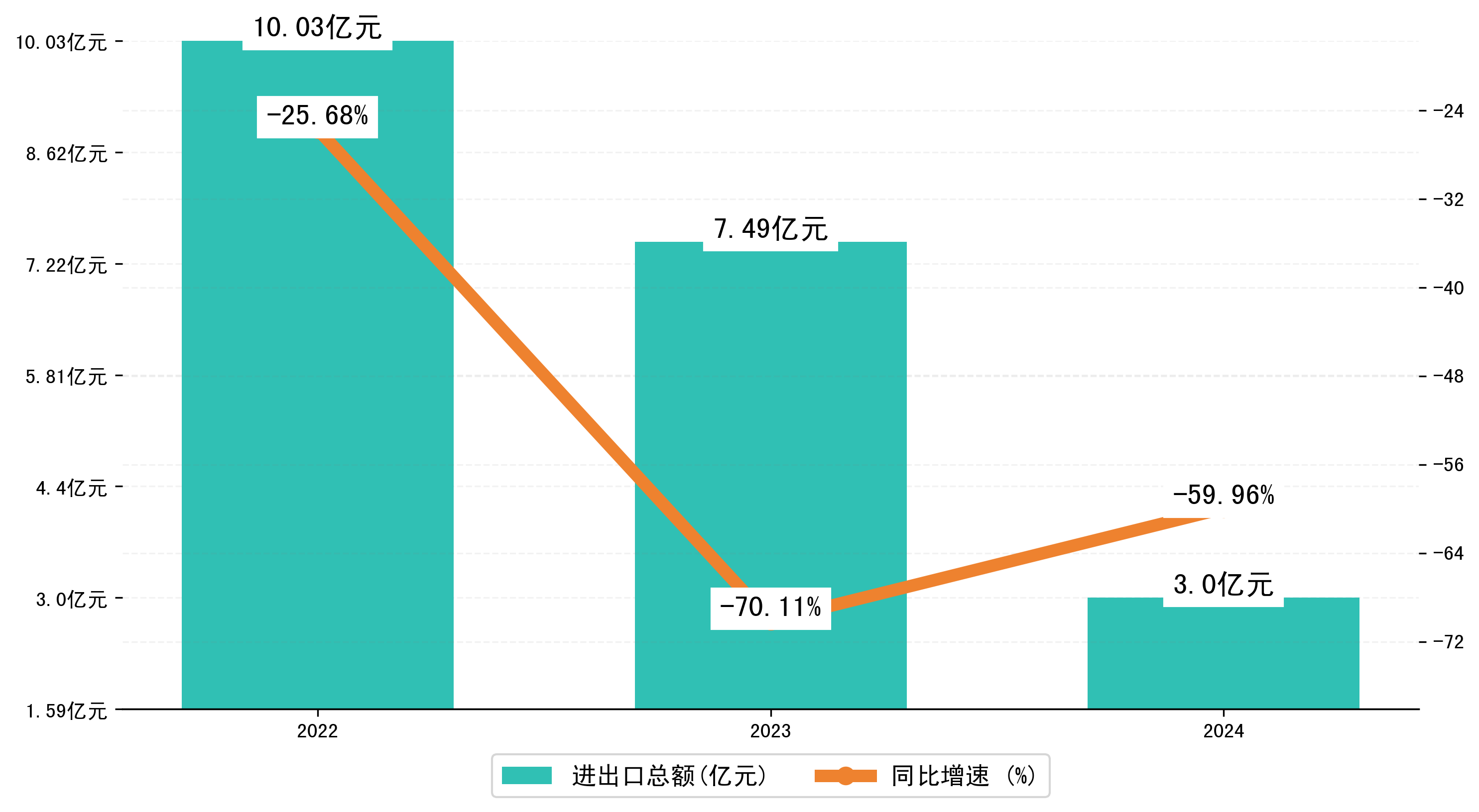 以人民币计,2024年1-3月石河子市进出口总额为2,9983.3142万元,相比上年同期减少了4,4906.3302万元,同比减少了-60.00%。