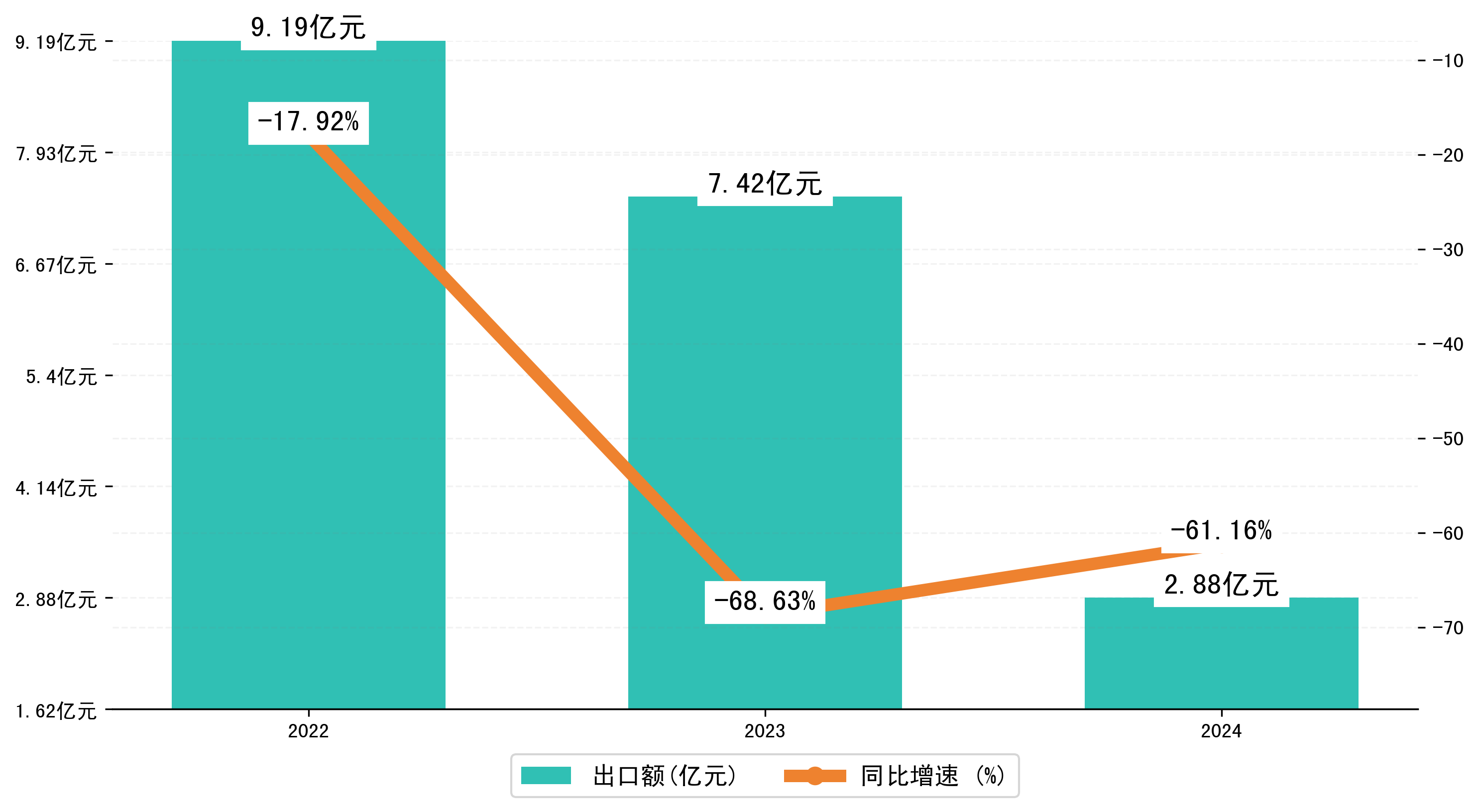 以美元计,2024年1-3月石河子市出口额为4059.6187万美元,相比上年同期减少了6721.6228万美元,同比减少-62.30%。