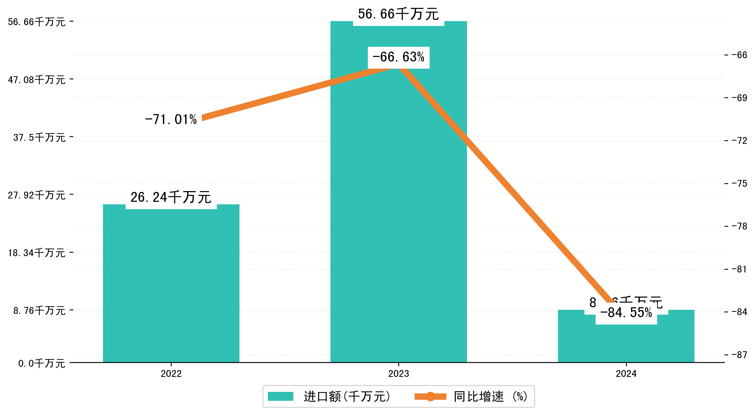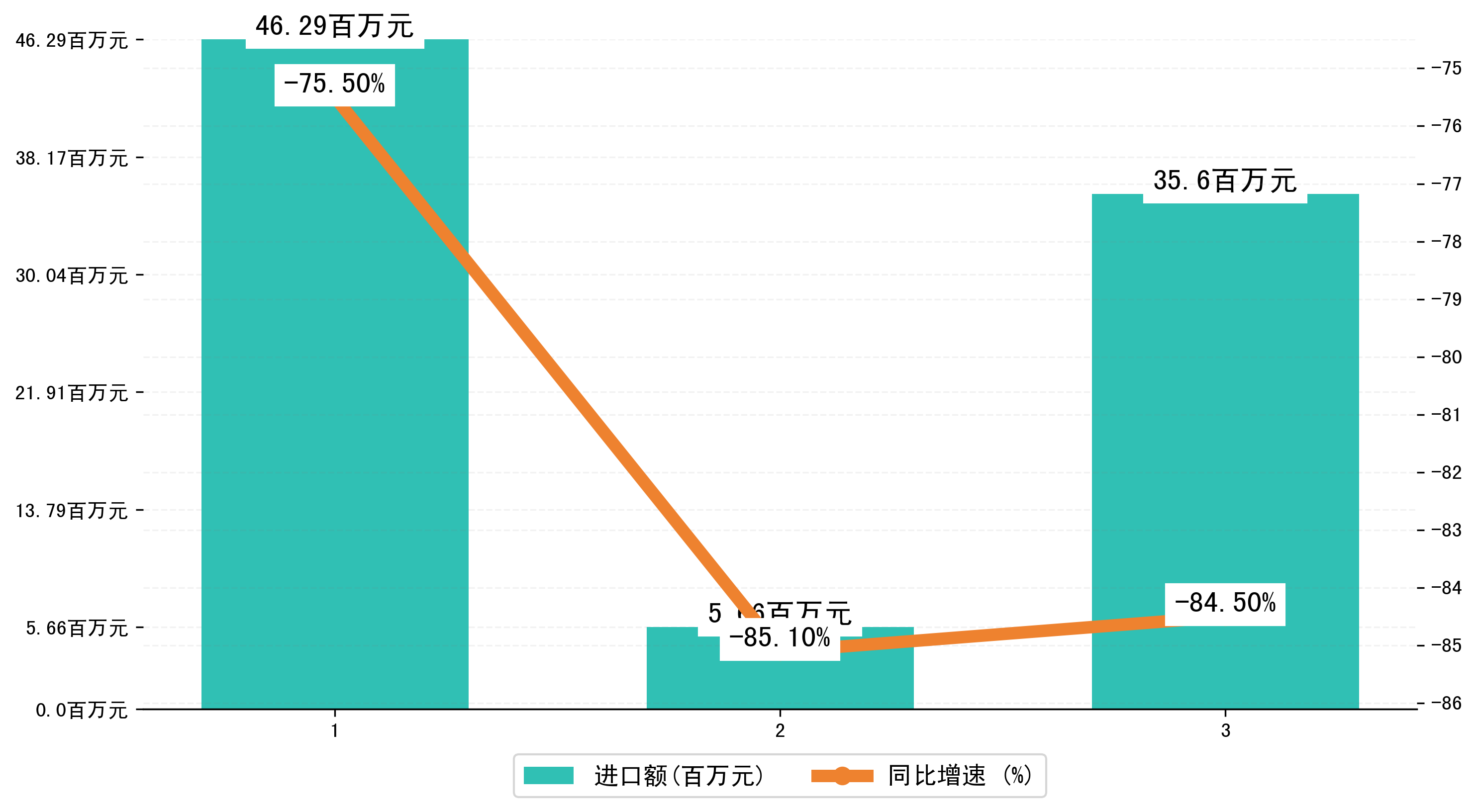 以美元计,2024年1-3月汉中市进口额为1234.052万美元,相比上年同期减少了7000.1841万美元,同比减少-85.00%。