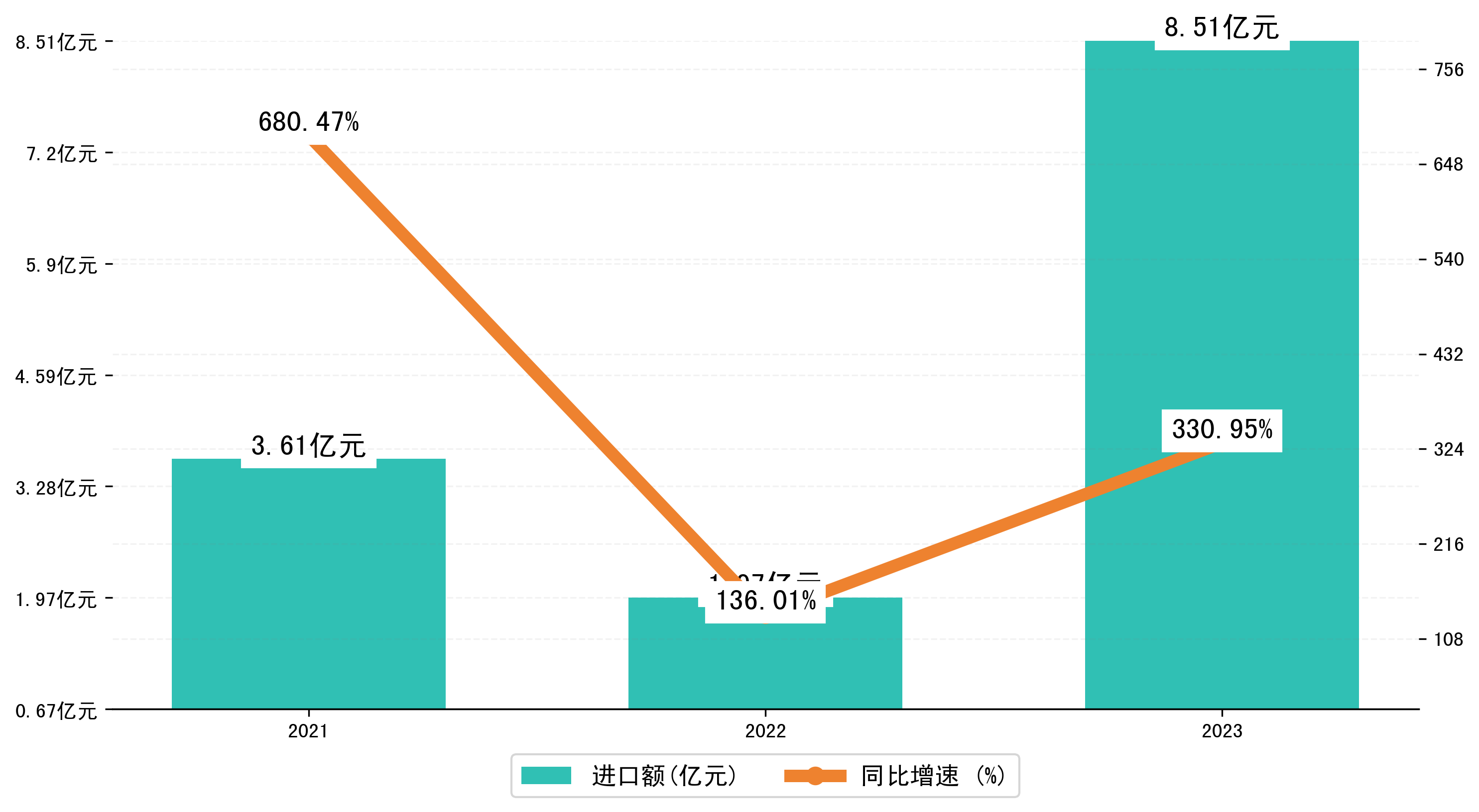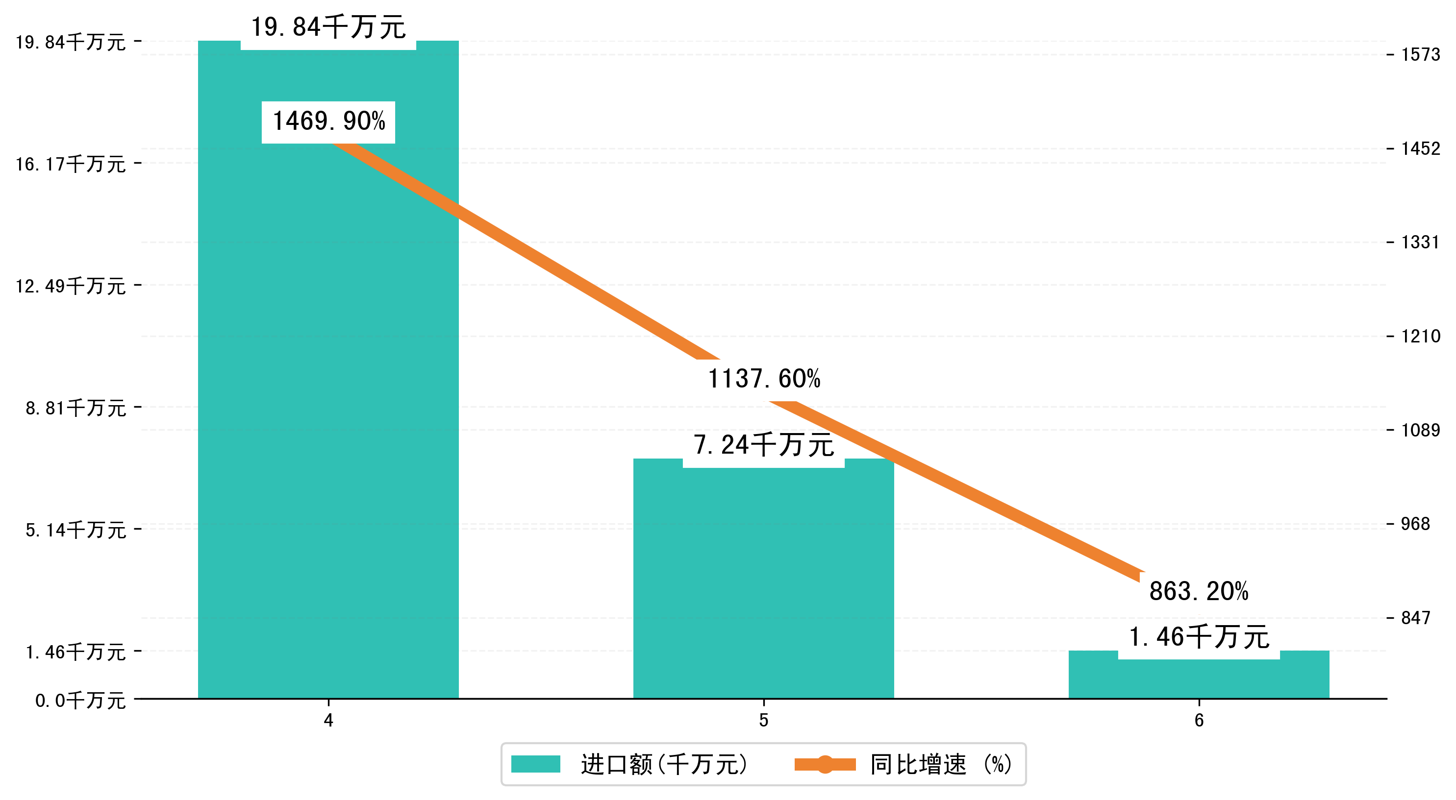 以人民币计,2023年1-6月汉中市进口额为8,5097.141万元,相比上年同期增加了6,5350.6688万元,同比增加了863.20%。