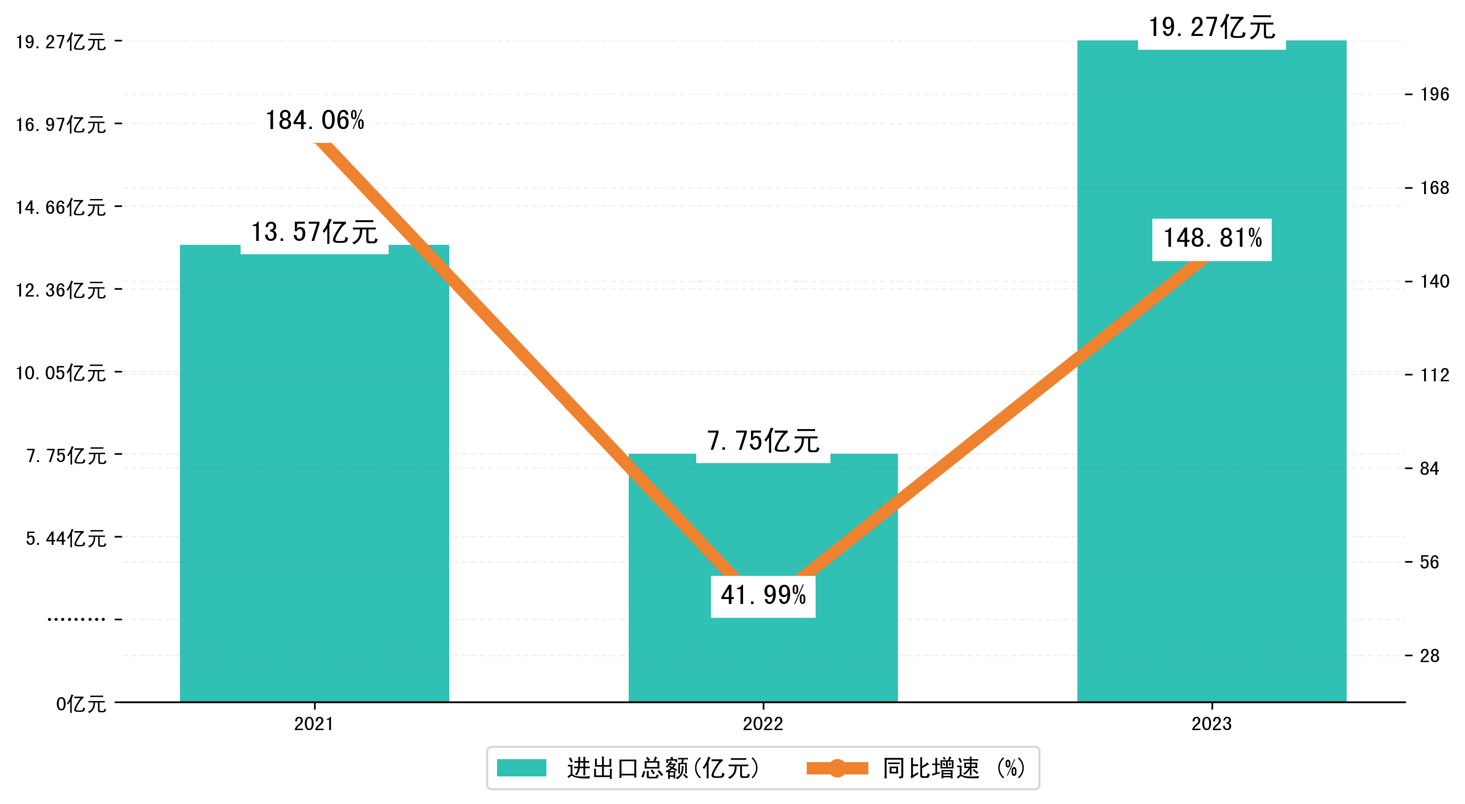 以美元计,2023年1-6月汉中市进出口总额为2,8018.9803万美元,相比上年同期增加了1,6069.2088万美元,同比增加223.80%。
