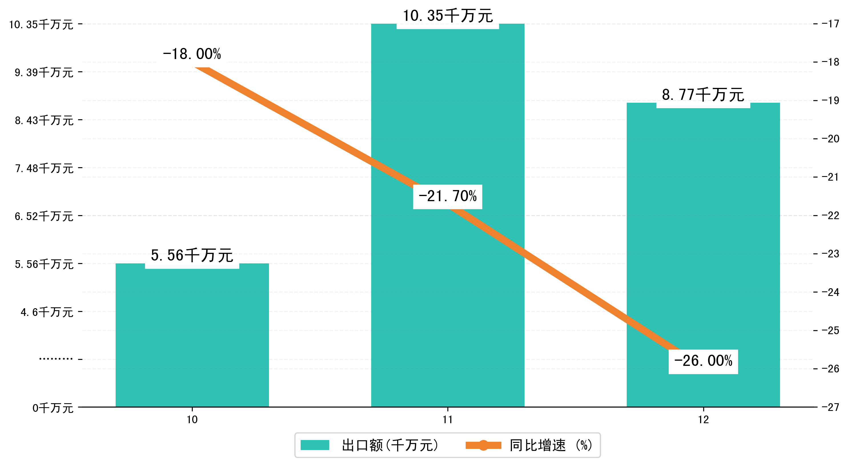 以美元计,2024年12月汉中市出口额为1220.5626万美元,相比上月减少了232.8924万美元;相比上年同期减少了2439.1501万美元,同比减少-26.40%。