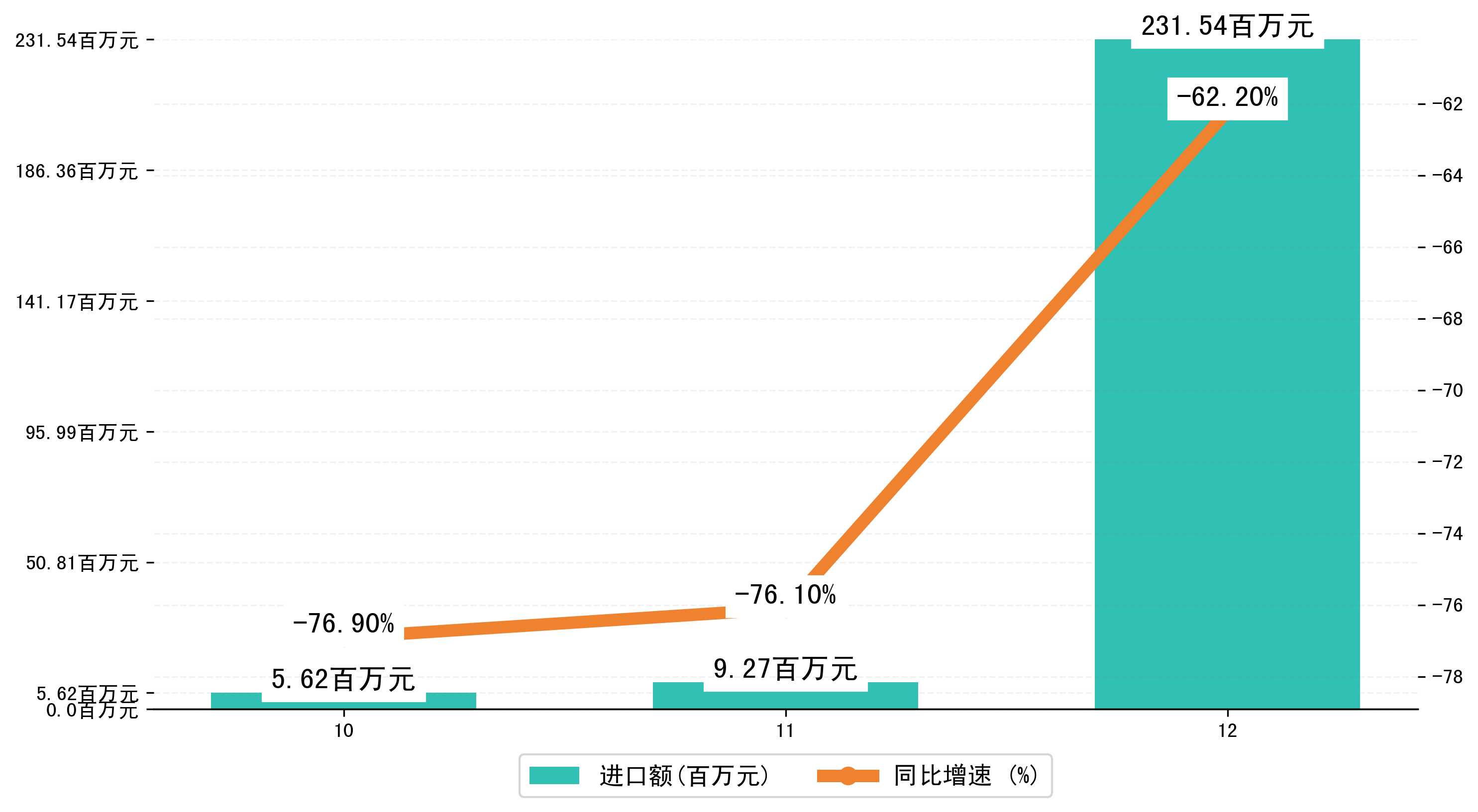 以人民币计,2024年1-12月汉中市进口额为4,5453.0772万元,相比上年同期减少了7,2894.4533万元,同比减少了-62.20%。