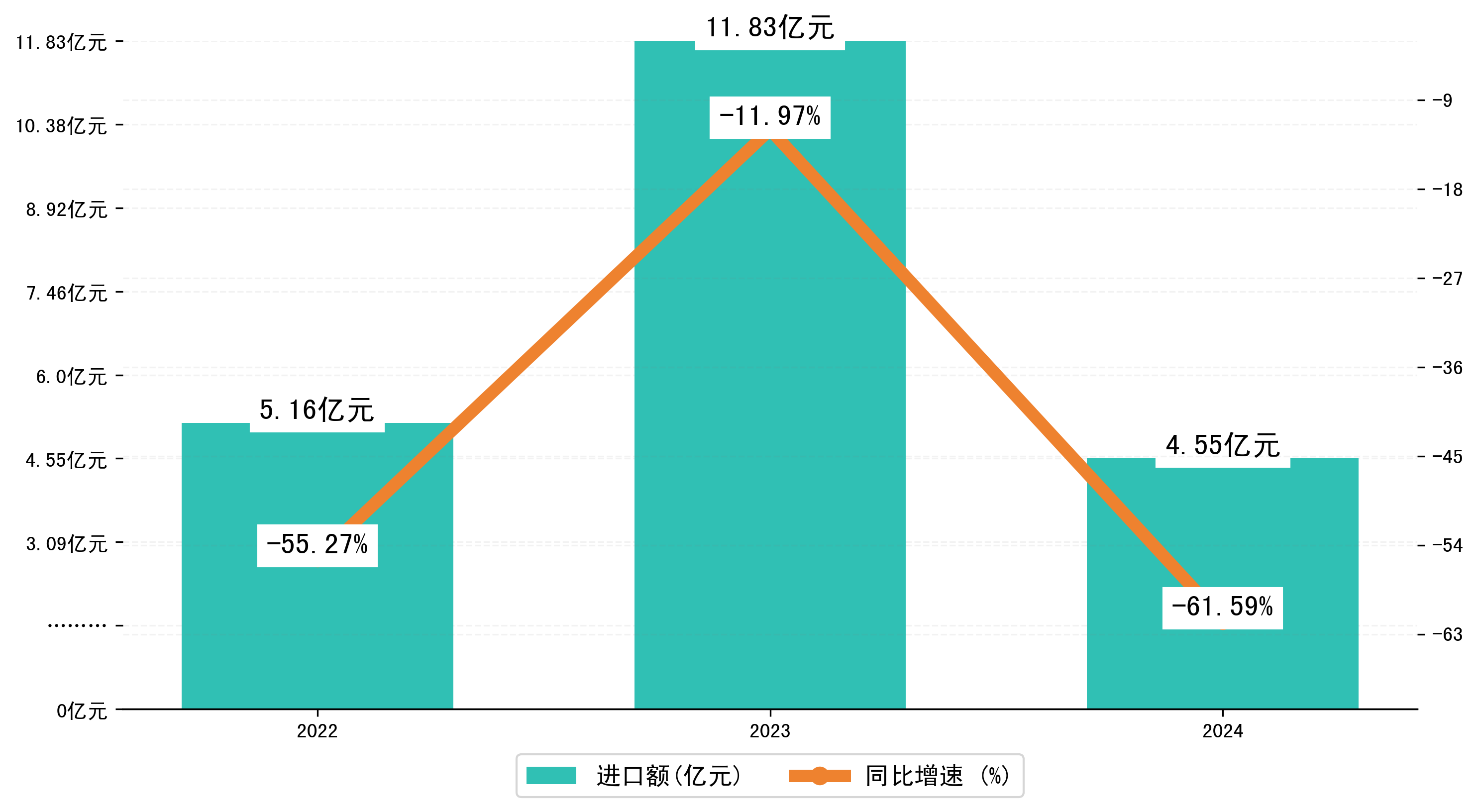 以美元计,2024年1-12月汉中市进口额为6359.4683万美元,相比上年同期减少了1,0646.6317万美元,同比减少-63.20%。
