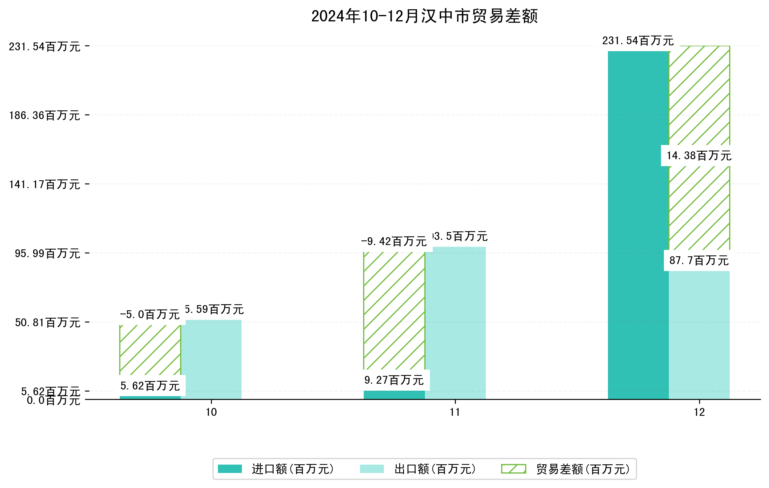 2024年12月汉中市进出口总额及进出口差额统计分析
