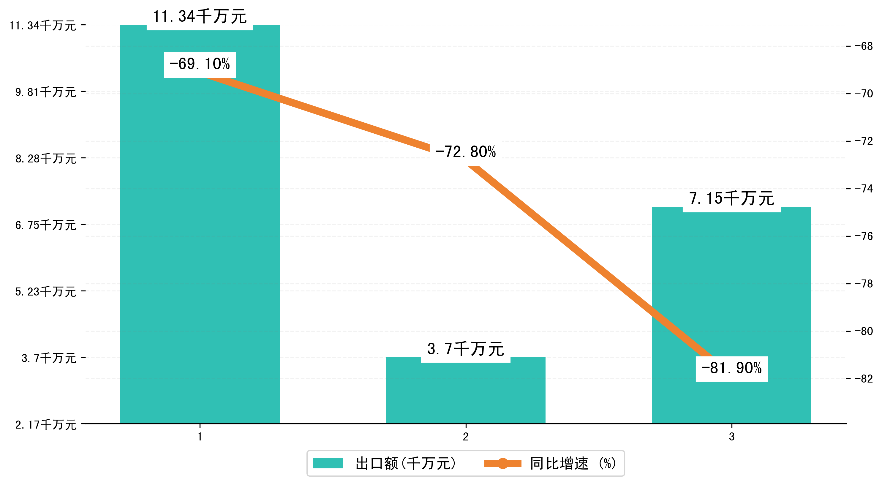 以美元计,2025年1-3月汉中市出口额为3089.238万美元,相比上年同期减少了1,4204.7157万美元,同比减少-82.10%。