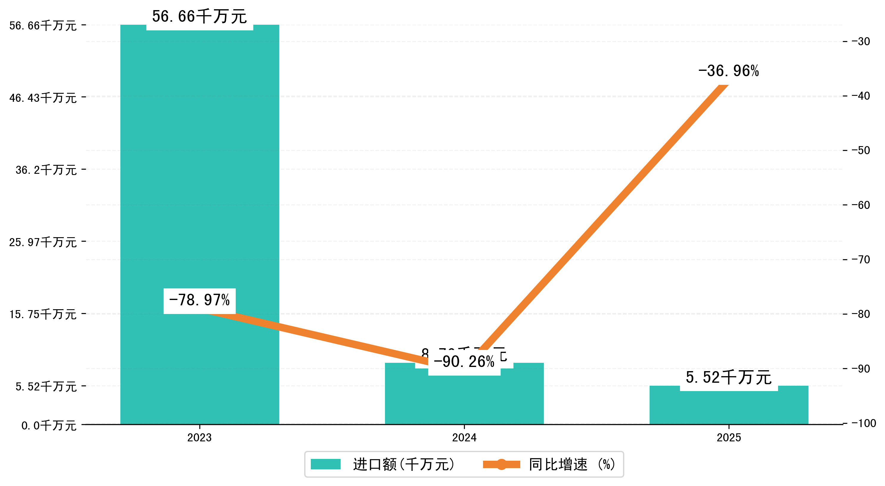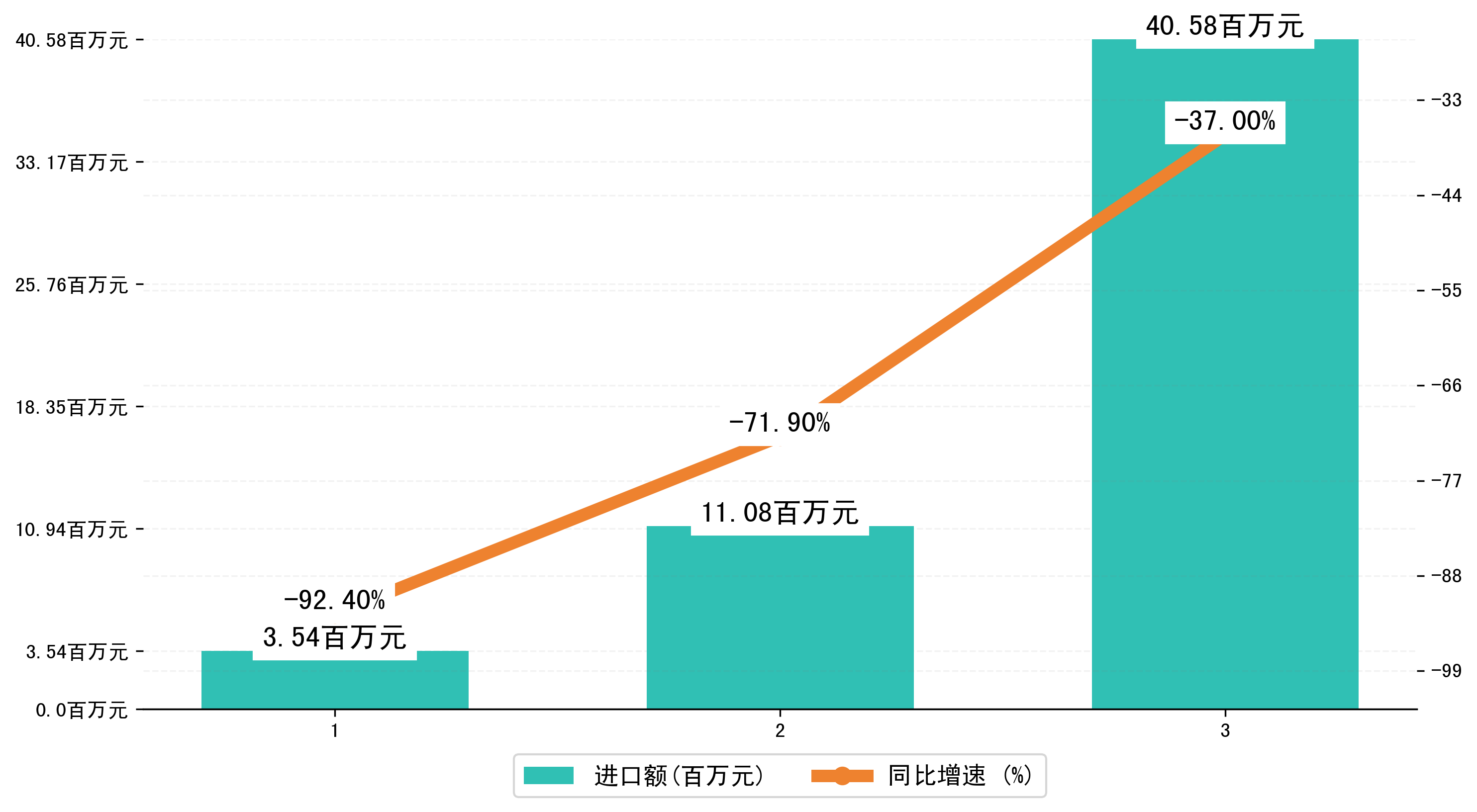 以人民币计,2025年1-3月汉中市进口额为5519.7488万元,相比上年同期减少了3235.8995万元,同比减少了-37.00%。