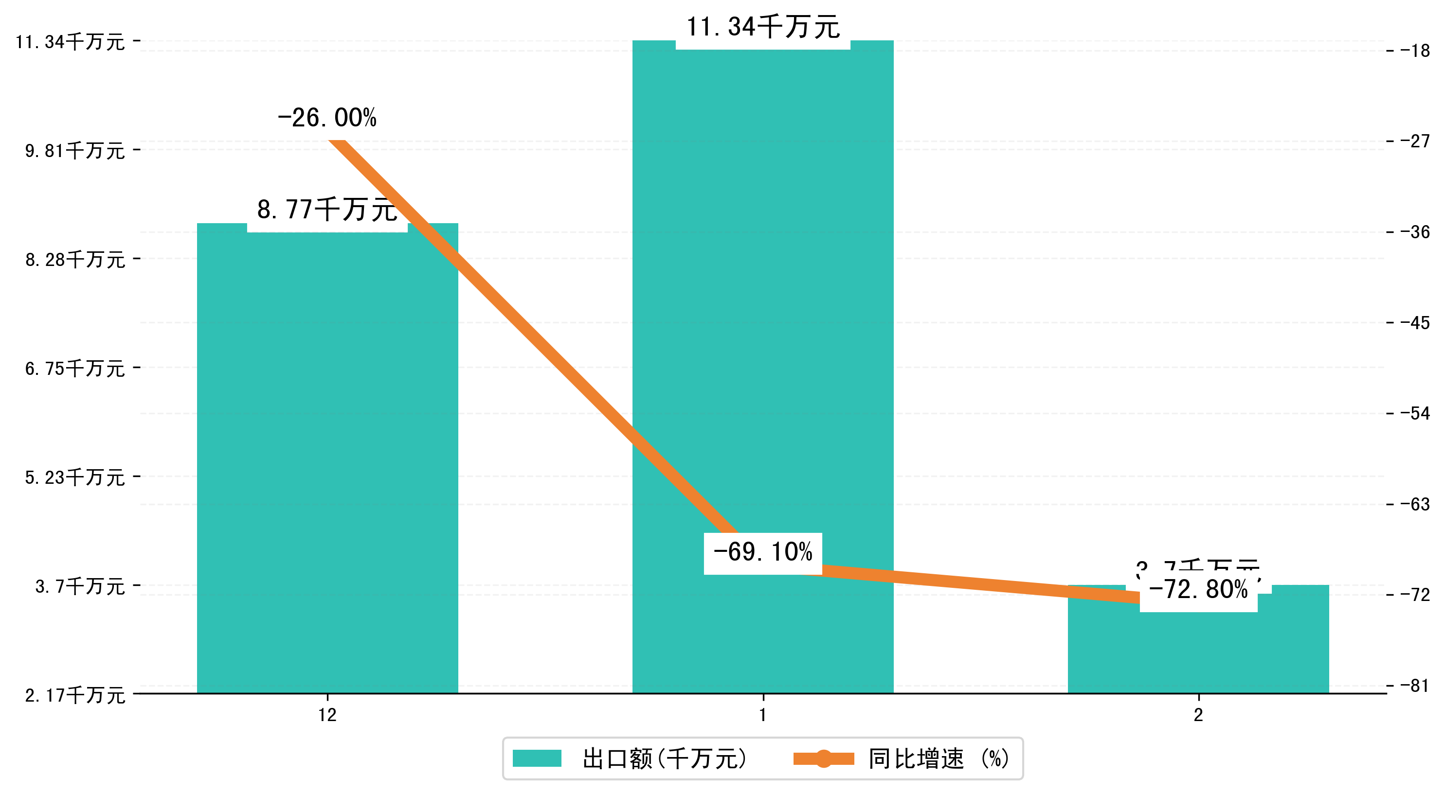 以美元计,2025年1-2月汉中市出口额为2092.0156万美元,相比上年同期减少了5692.1145万美元,同比减少-73.10%。
