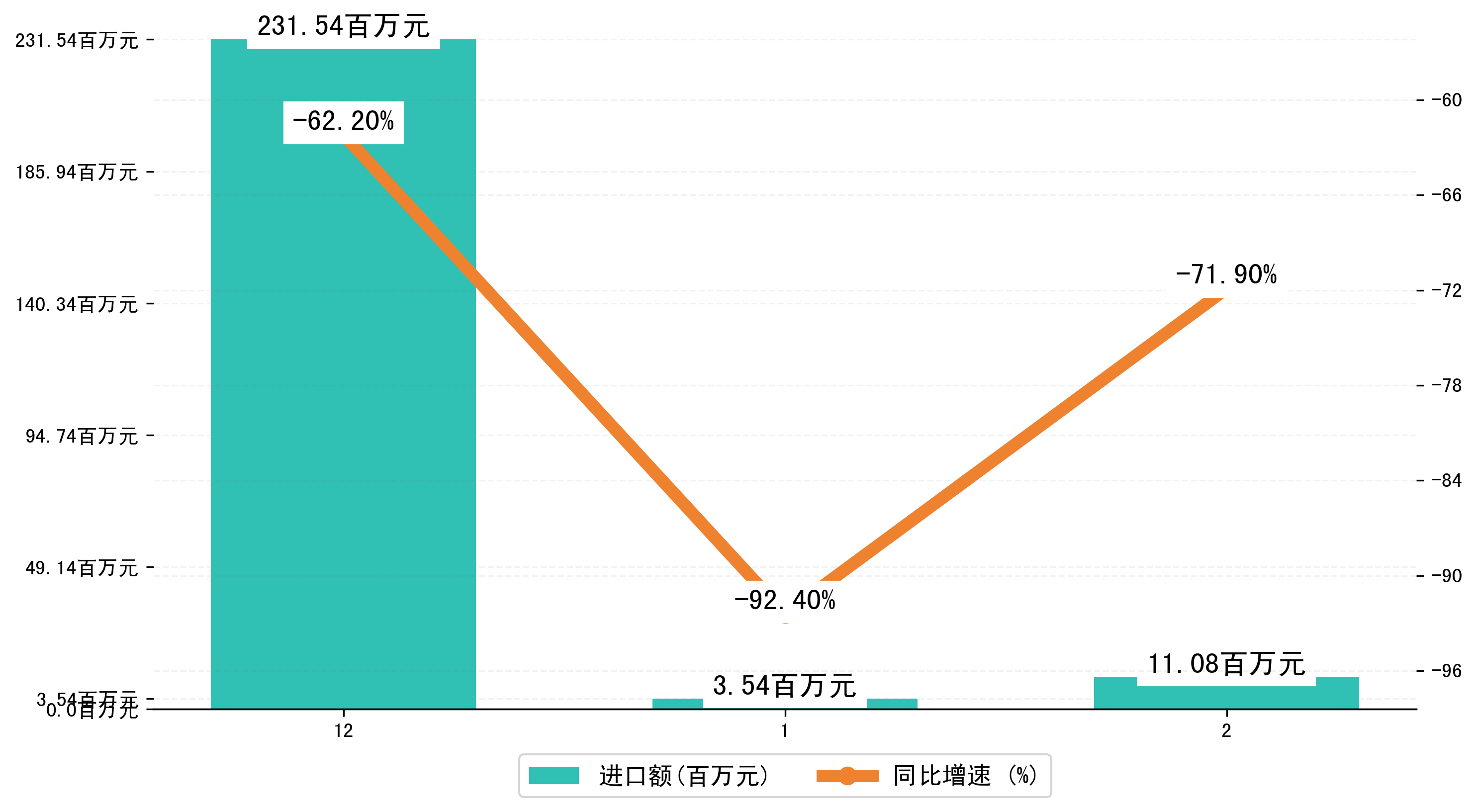 以美元计,2025年1-2月汉中市进口额为204.0391万美元,相比上年同期减少了527.9264万美元,同比减少-72.10%。