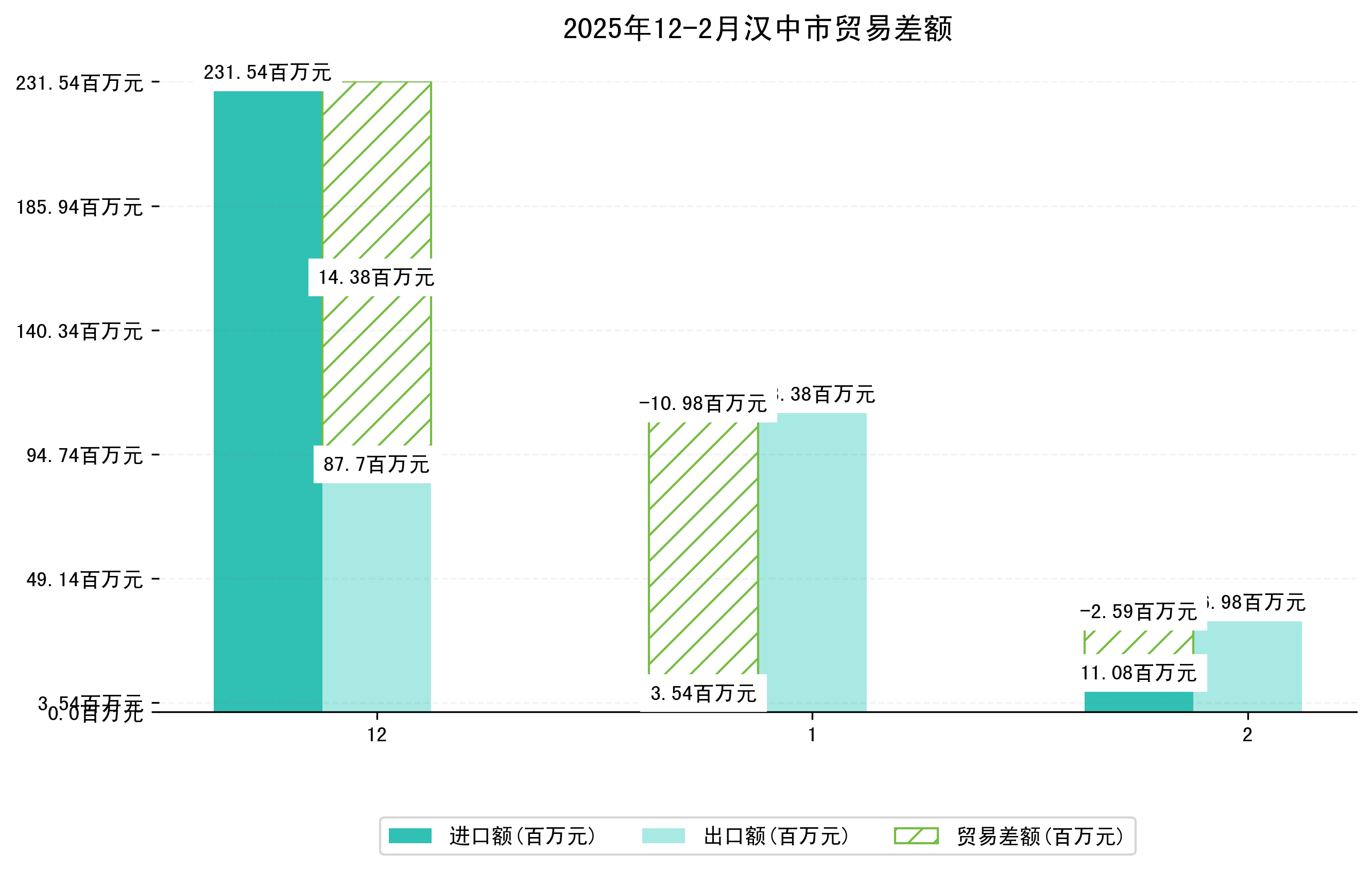 2025年2月汉中市进出口总额及进出口差额统计分析