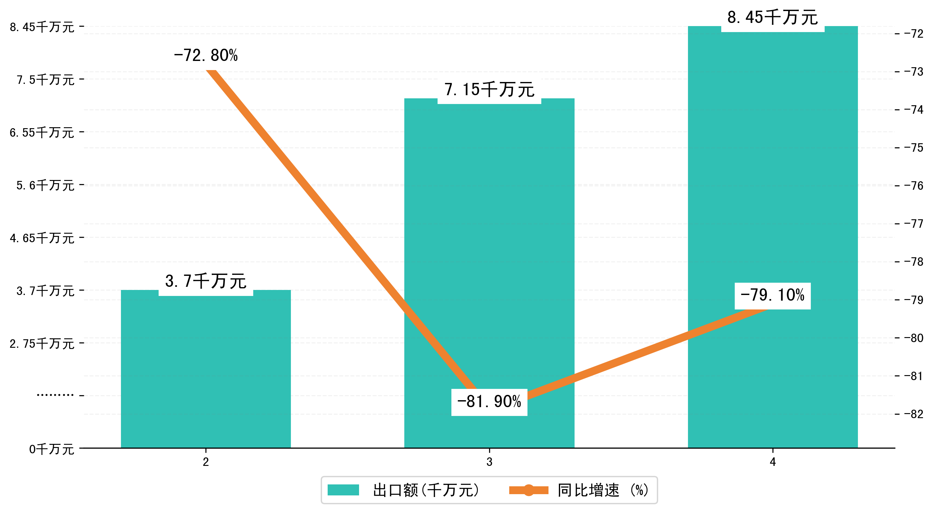 以人民币计,2025年4月汉中市出口额为8453.6872万元,相比上月增加了1301.197万元;相比上年同期减少了1,4882.8967万元,同比减少了-79.10%。