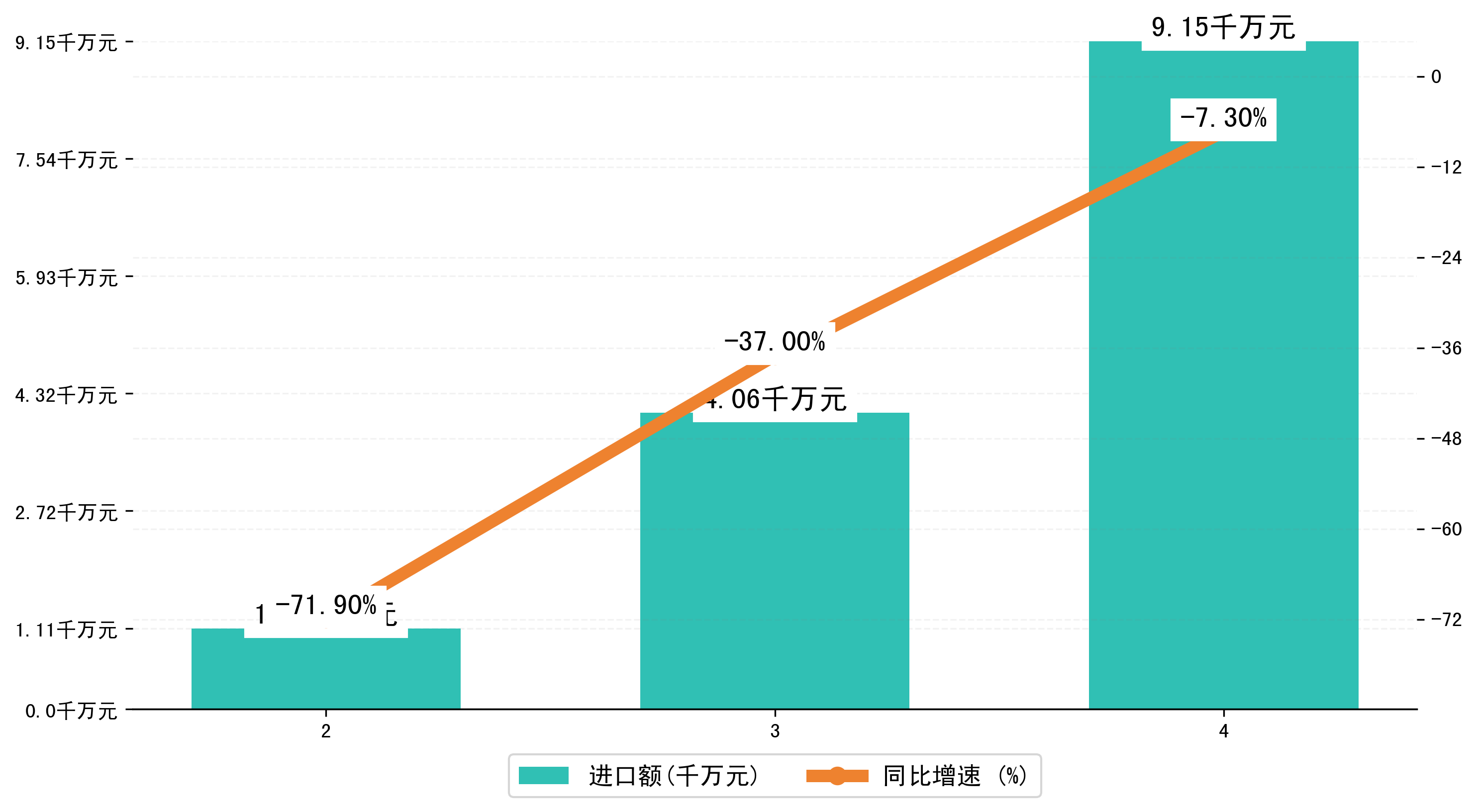 以人民币计,2025年4月汉中市进口额为9145.1252万元,相比上月增加了5086.9825万元;相比上年同期增加了2079.585万元,同比减少了-7.30%。