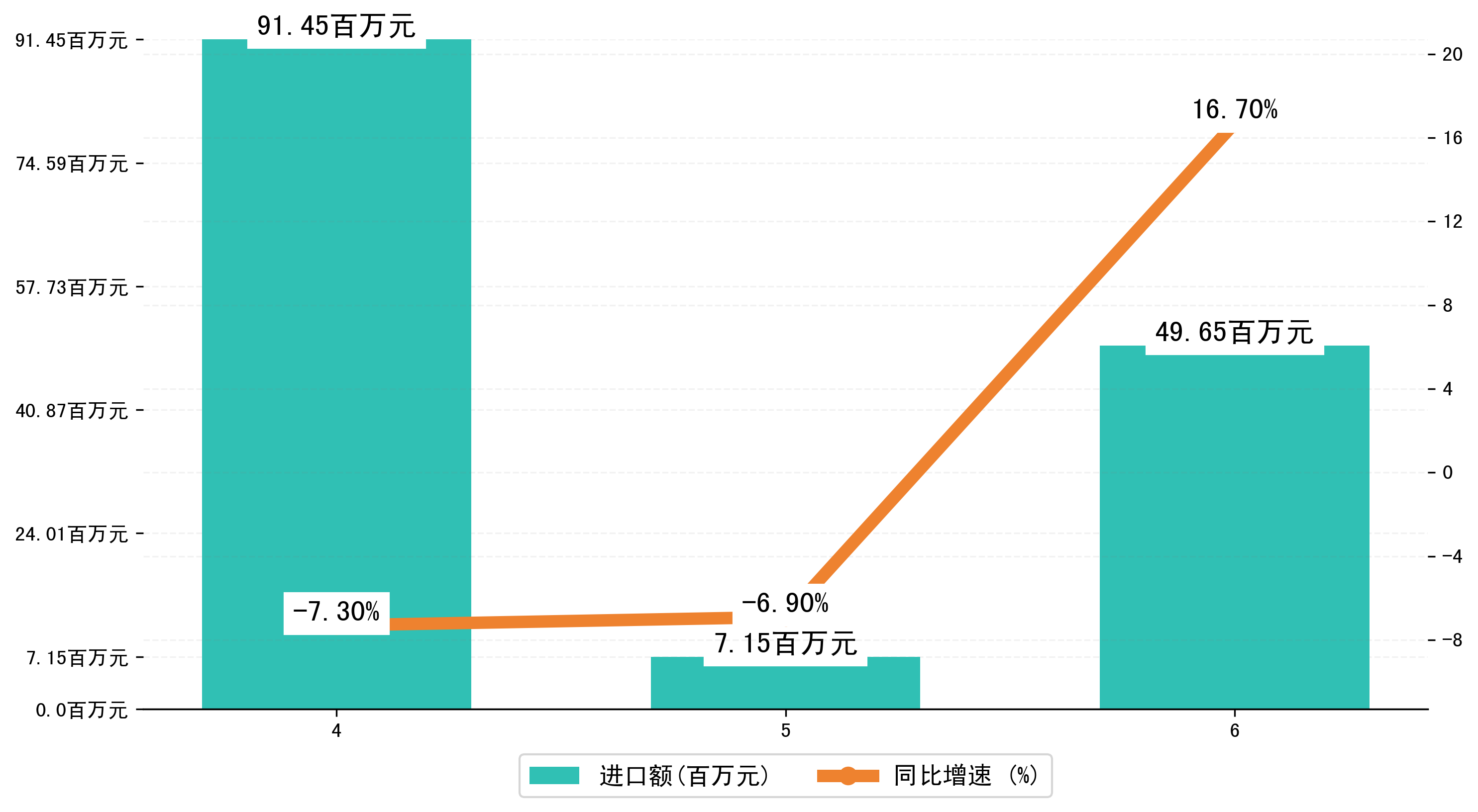 以美元计,2025年6月汉中市进口额为692.8541万美元,相比上月增加了593.7431万美元;相比上年同期增加了564.209万美元,同比增加15.00%。