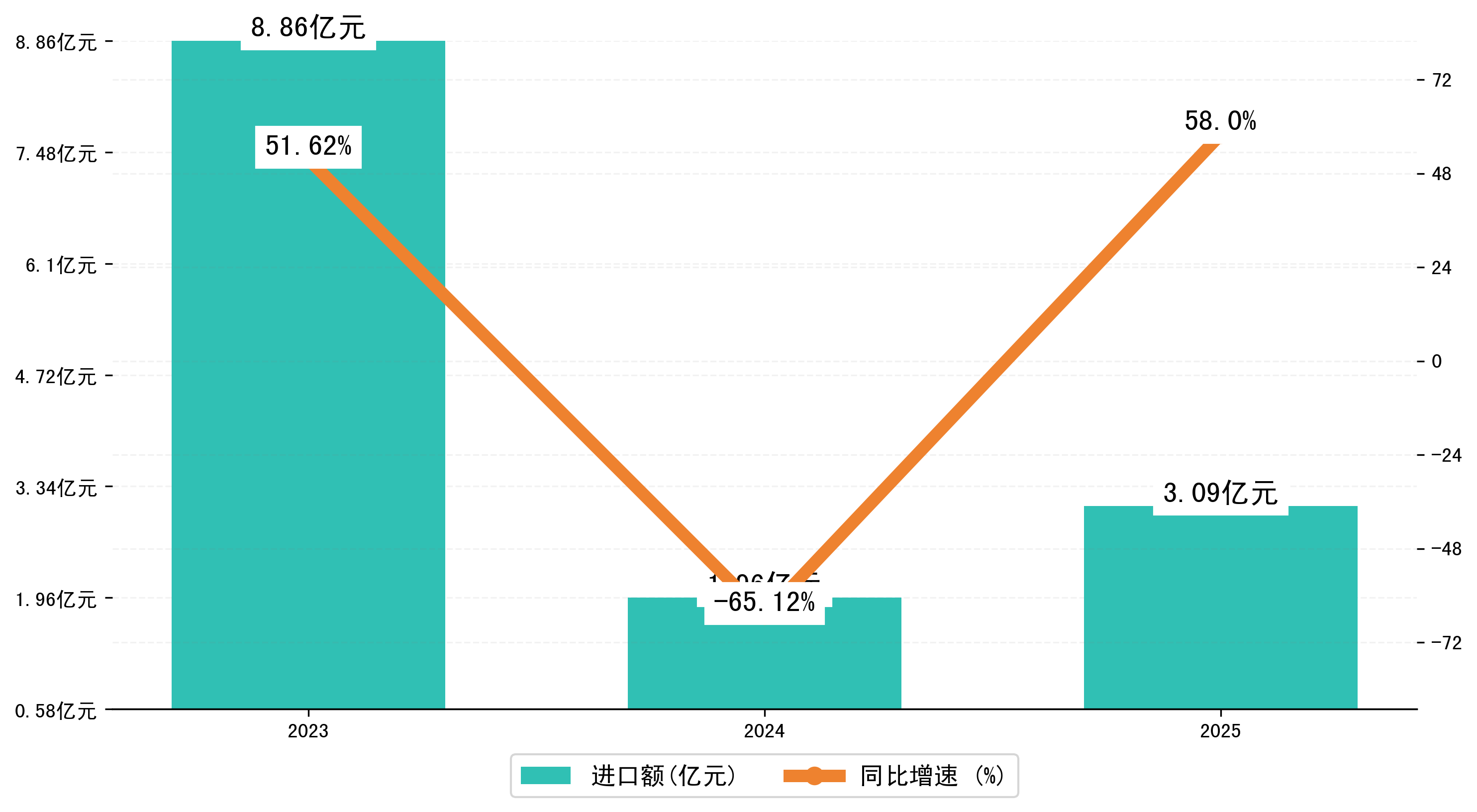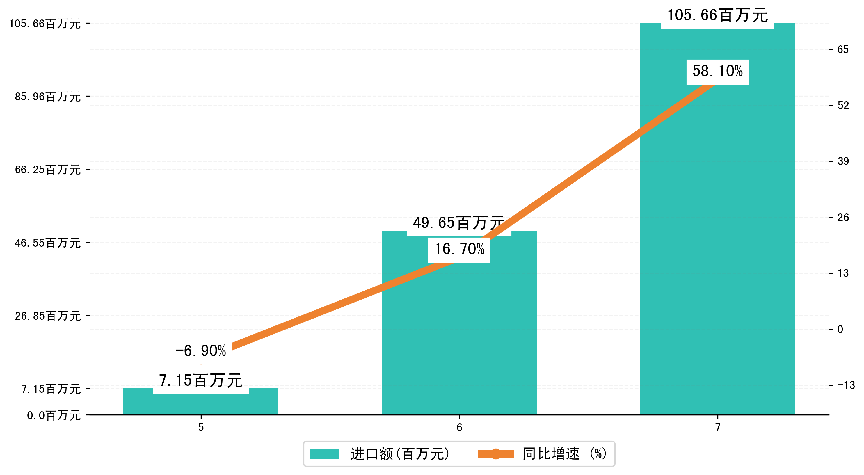 以人民币计,2025年1-7月汉中市进口额为3,0909.9561万元,相比上年同期增加了1,1346.9437万元,同比增加了58.10%。