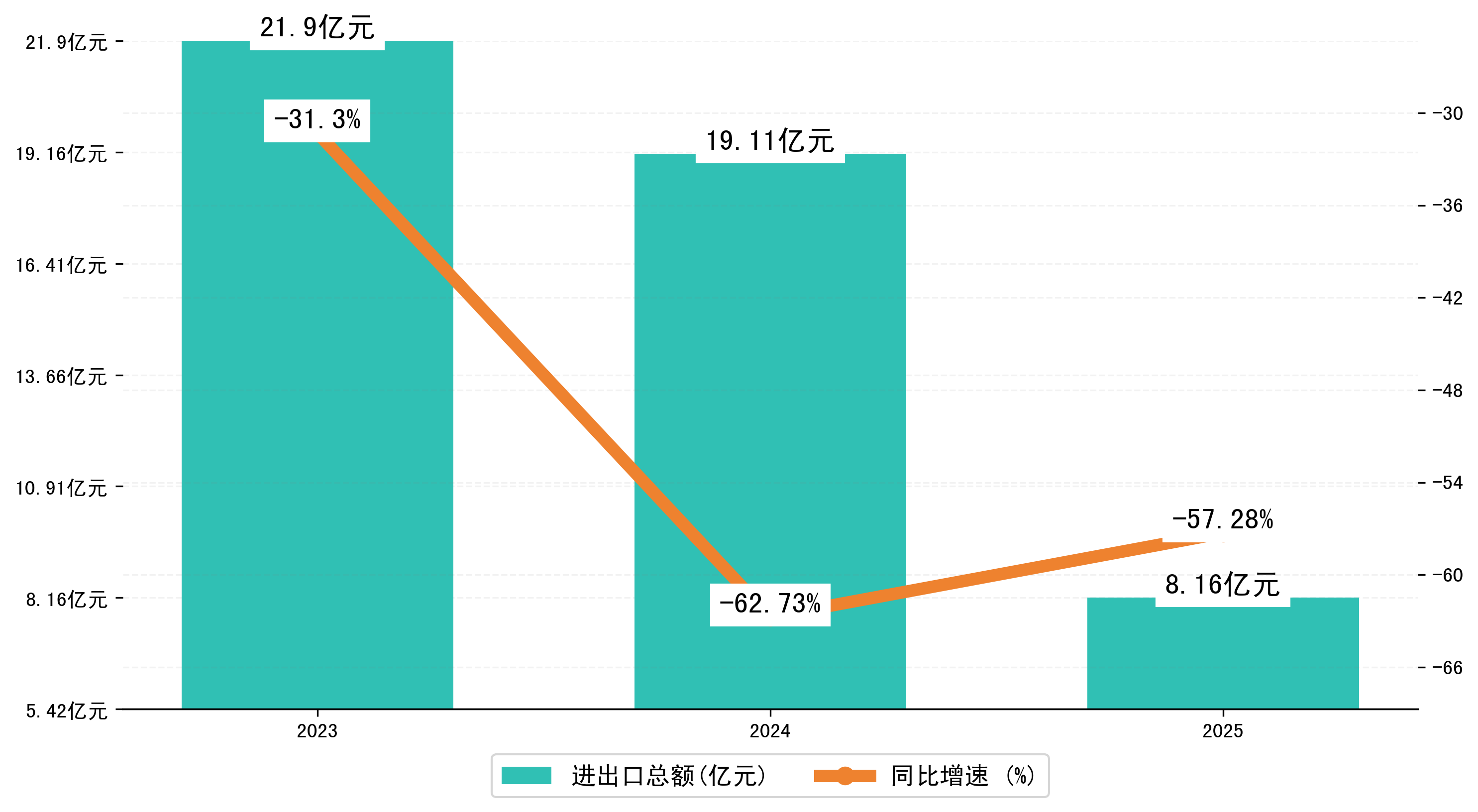以人民币计,2025年1-7月汉中市进出口总额为8,1638.6504万元,相比上年同期减少了10,9452.1146万元,同比减少了-57.30%。