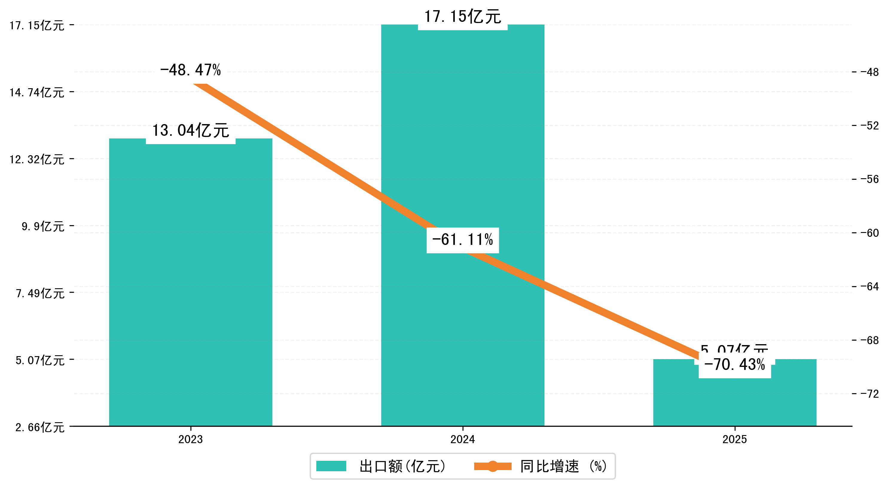以美元计,2025年1-7月汉中市出口额为7061.5546万美元,相比上年同期减少了1,7091.1237万美元,同比减少-70.80%。