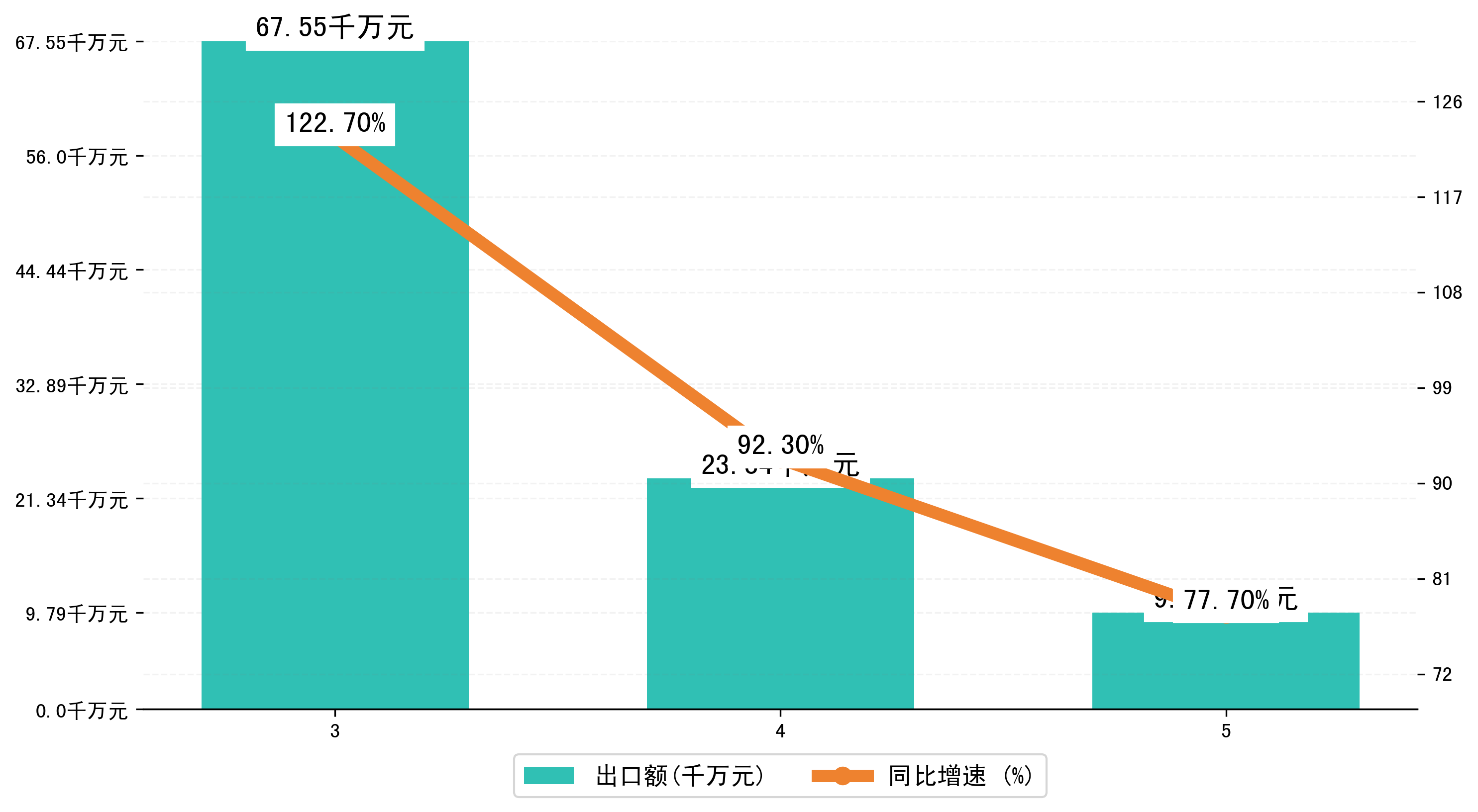 以人民币计,2024年5月汉中市出口额为9785.4563万元,相比上月减少了1,3551.1276万元;相比上年同期减少了1925.1455万元,同比增加了77.70%。