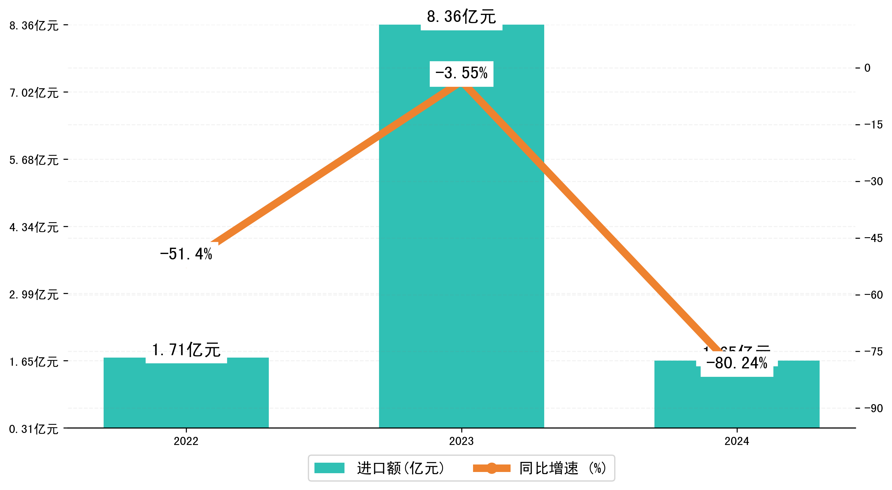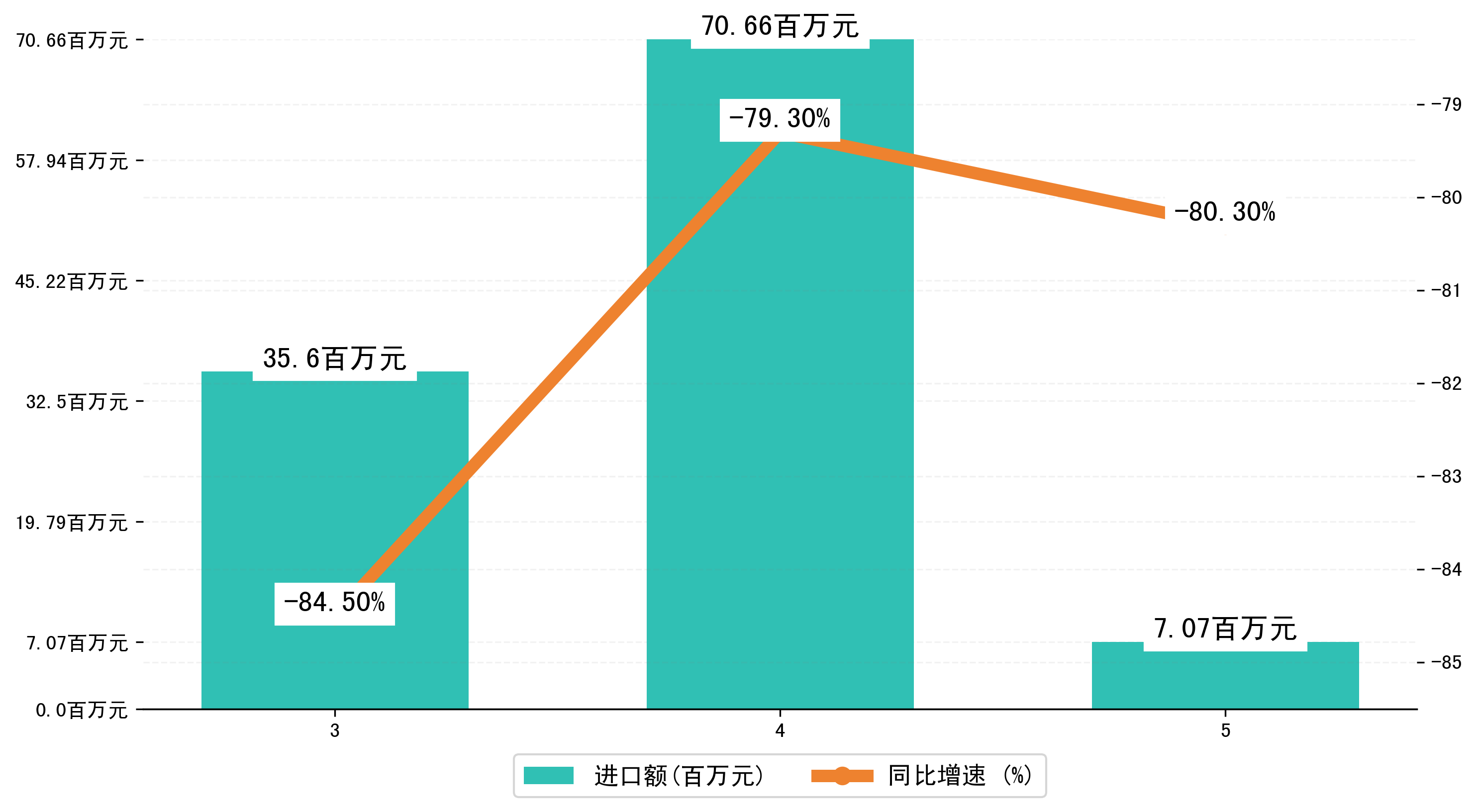 以人民币计,2024年1-5月汉中市进口额为1,6528.2831万元,相比上年同期减少了6,7107.4112万元,同比减少了-80.30%。