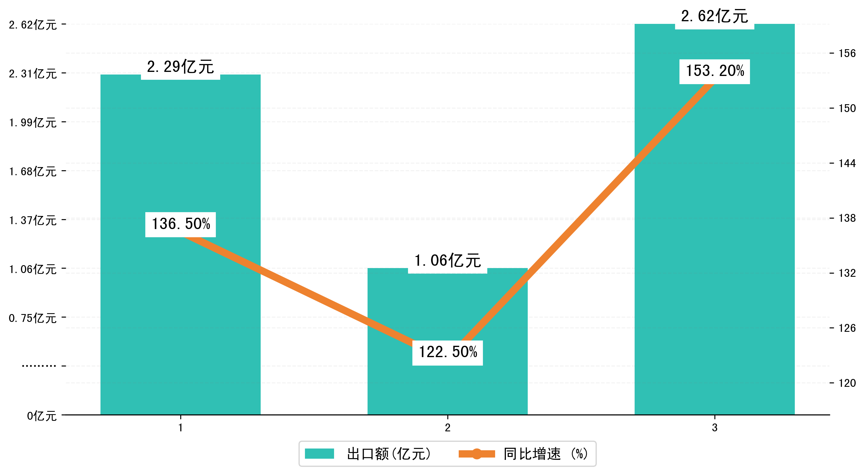以人民币计,2023年1-3月汉中市出口额为5,9681.6144万元,相比上年同期增加了2,5992.5321万元,同比增加了153.20%。