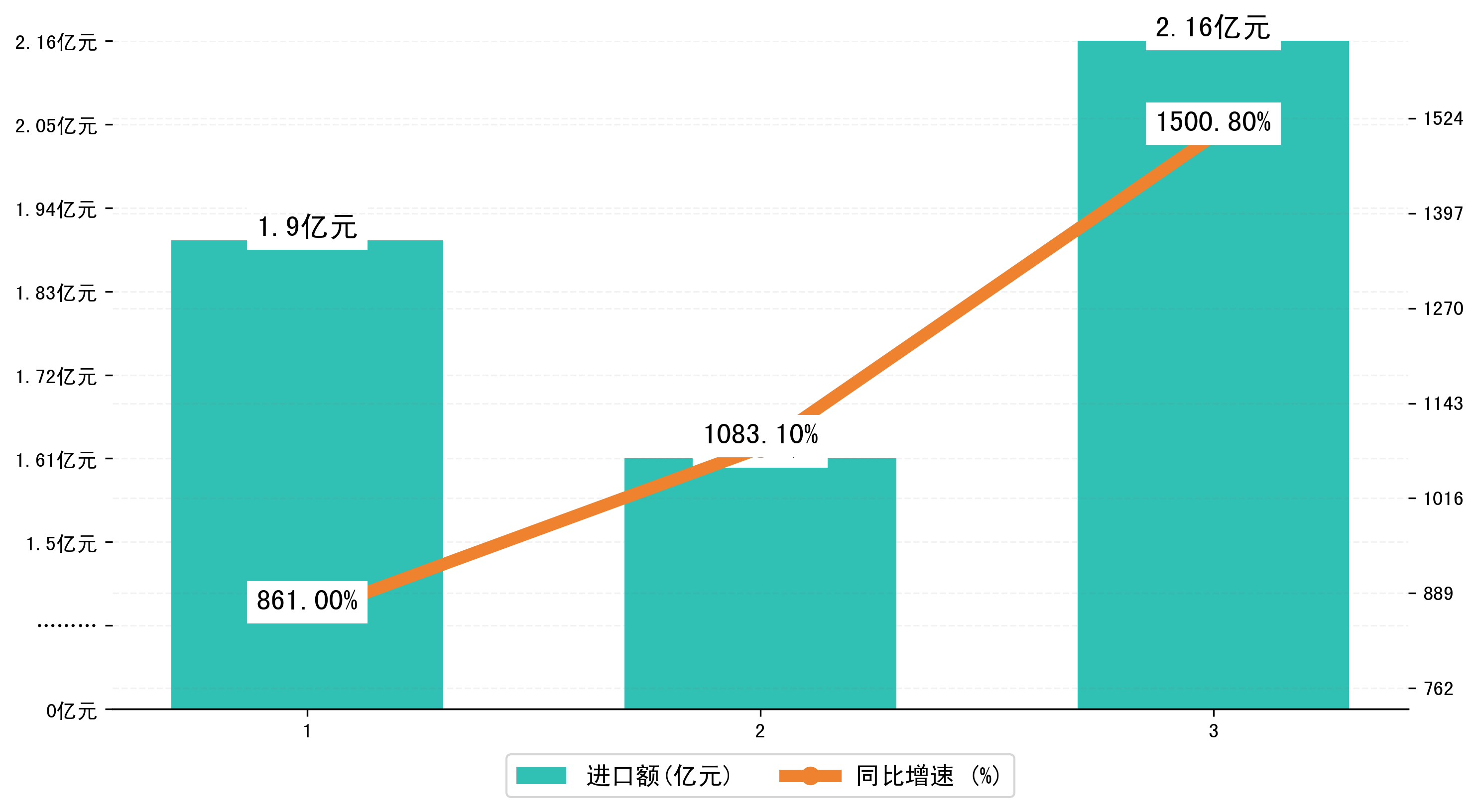 以人民币计,2023年1-3月汉中市进口额为5,6655.3882万元,相比上年同期增加了3,0413.5931万元,同比增加了1500.80%。