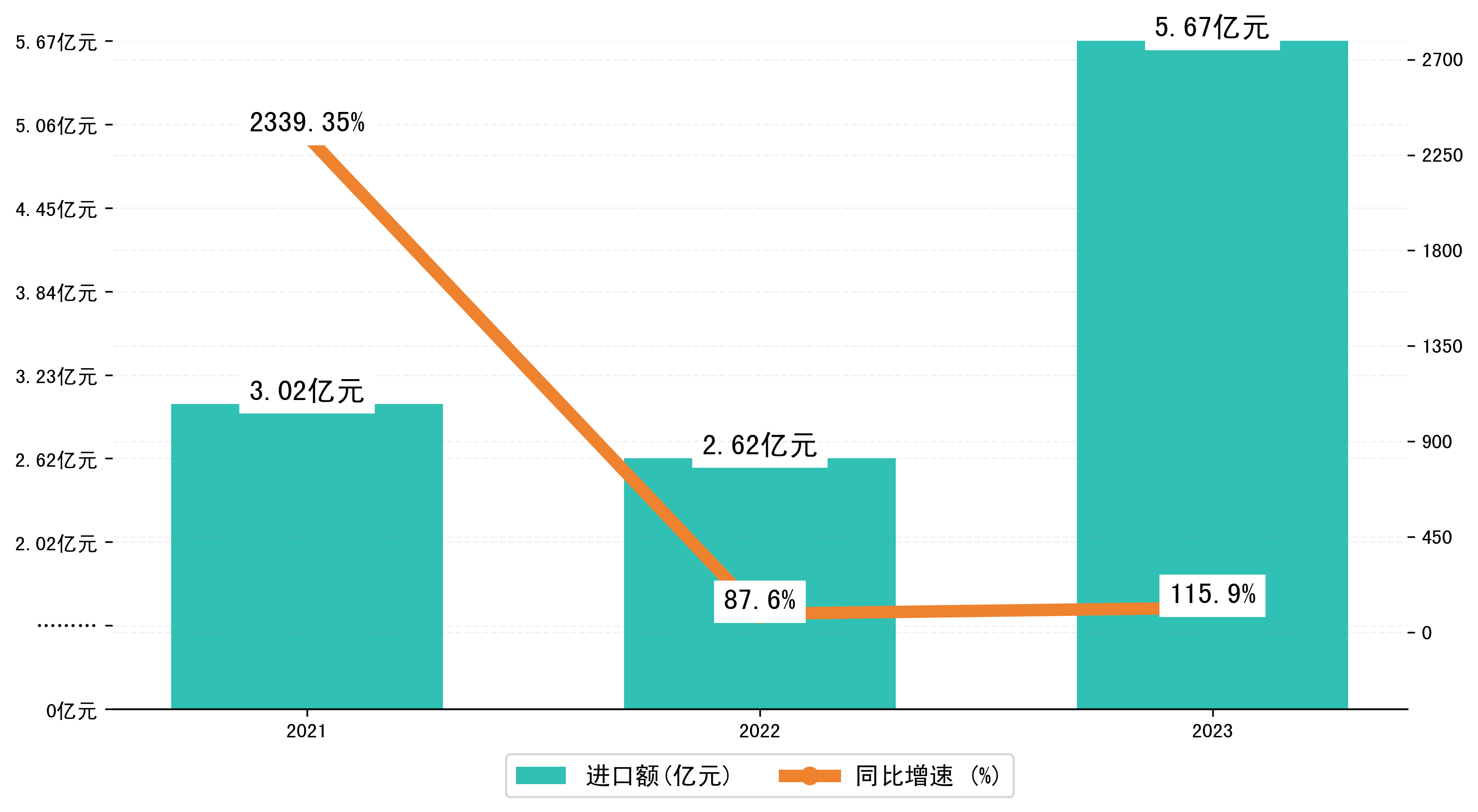 以美元计,2023年1-3月汉中市进口额为8234.2361万美元,相比上年同期增加了4102.4084万美元,同比增加1384.10%。