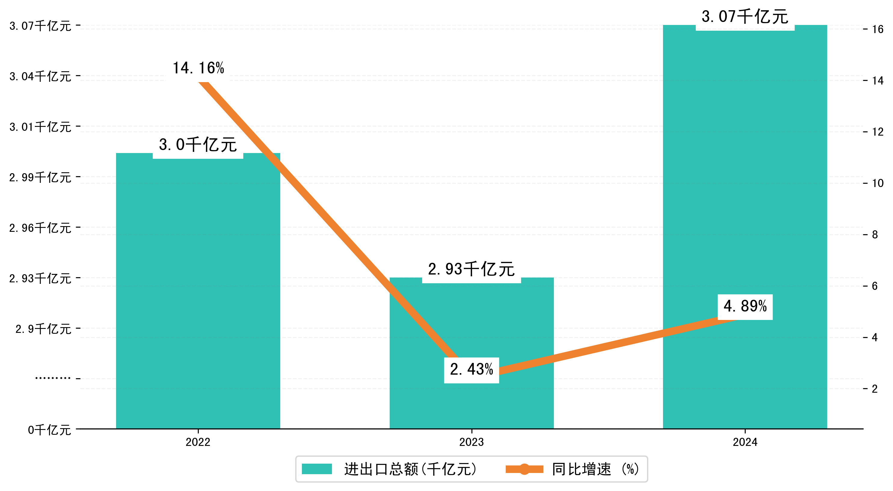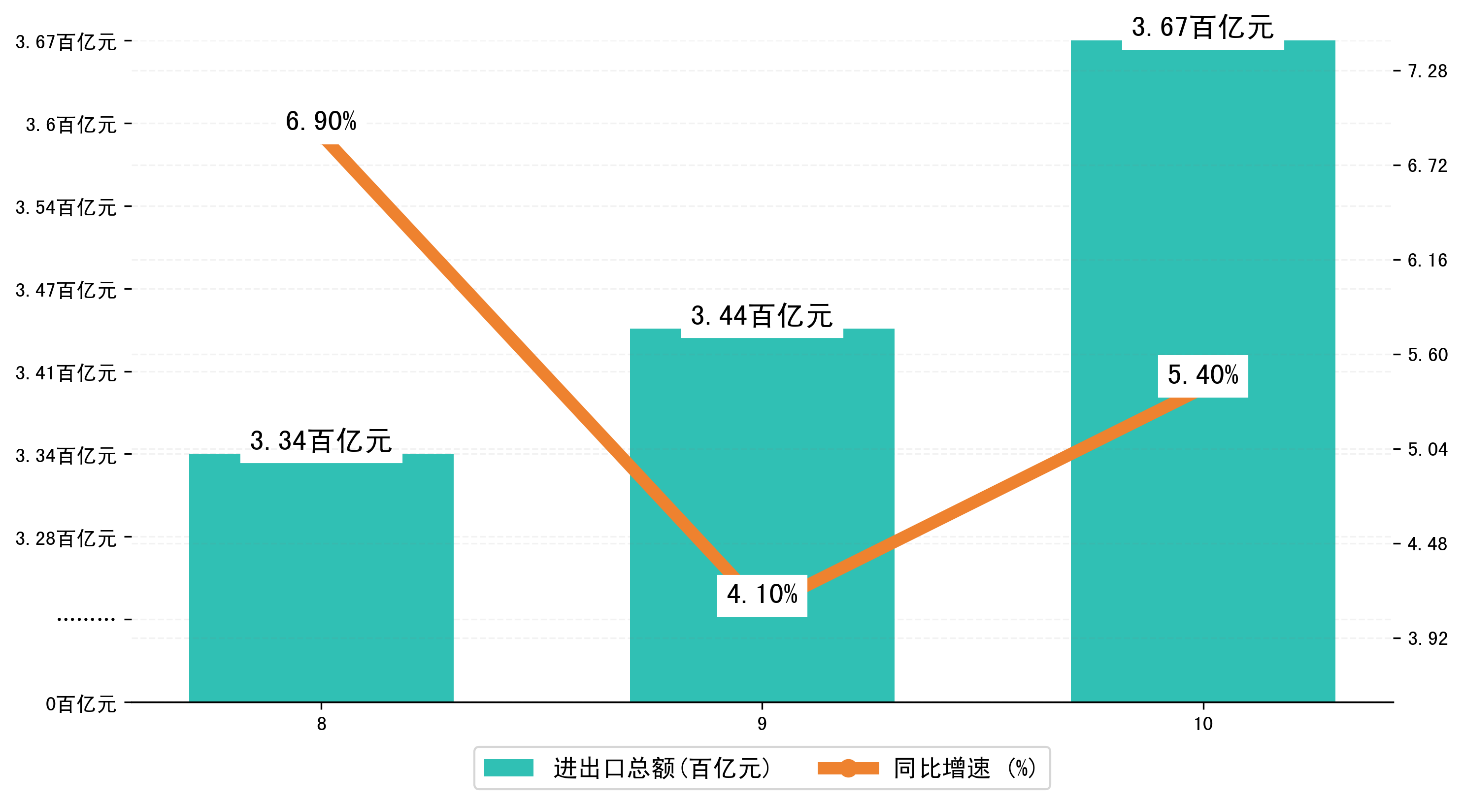 以人民币计,2024年1-10月合肥市进出口总额为3071,9045.8034万元,相比上年同期增加了143,2871.4234万元,同比增加了5.40%。