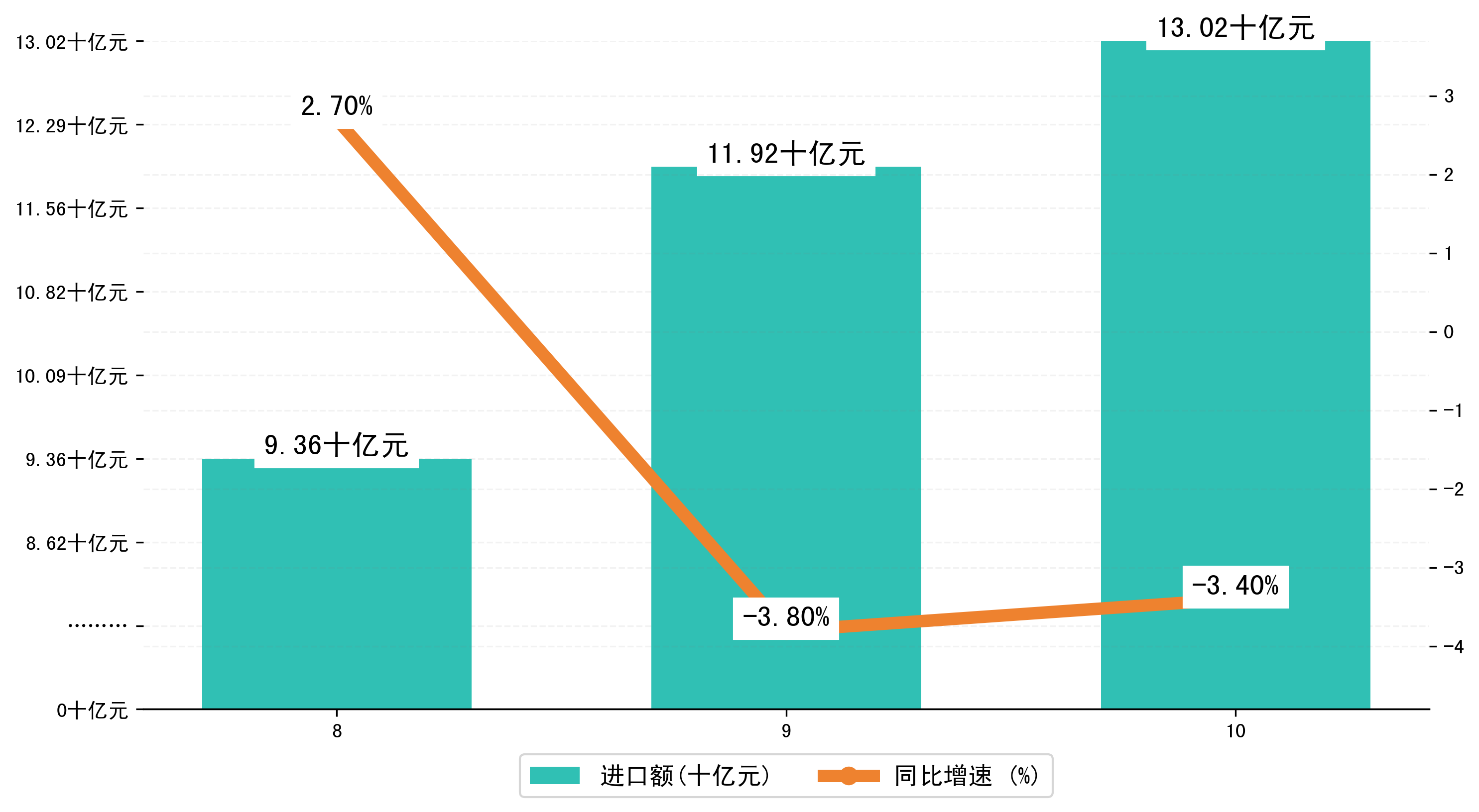 以人民币计,2024年10月合肥市进口额为130,2162.8263万元,相比上月增加了11,0471.83万元;相比上年同期减少了1,0283.4612万元,同比减少了-3.40%。
